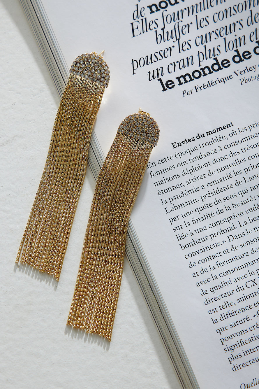 Bring the glam with the 18k Gold Plated Golden Times Earrings. Featuring a gold finish with diamantes and a fringe.Â