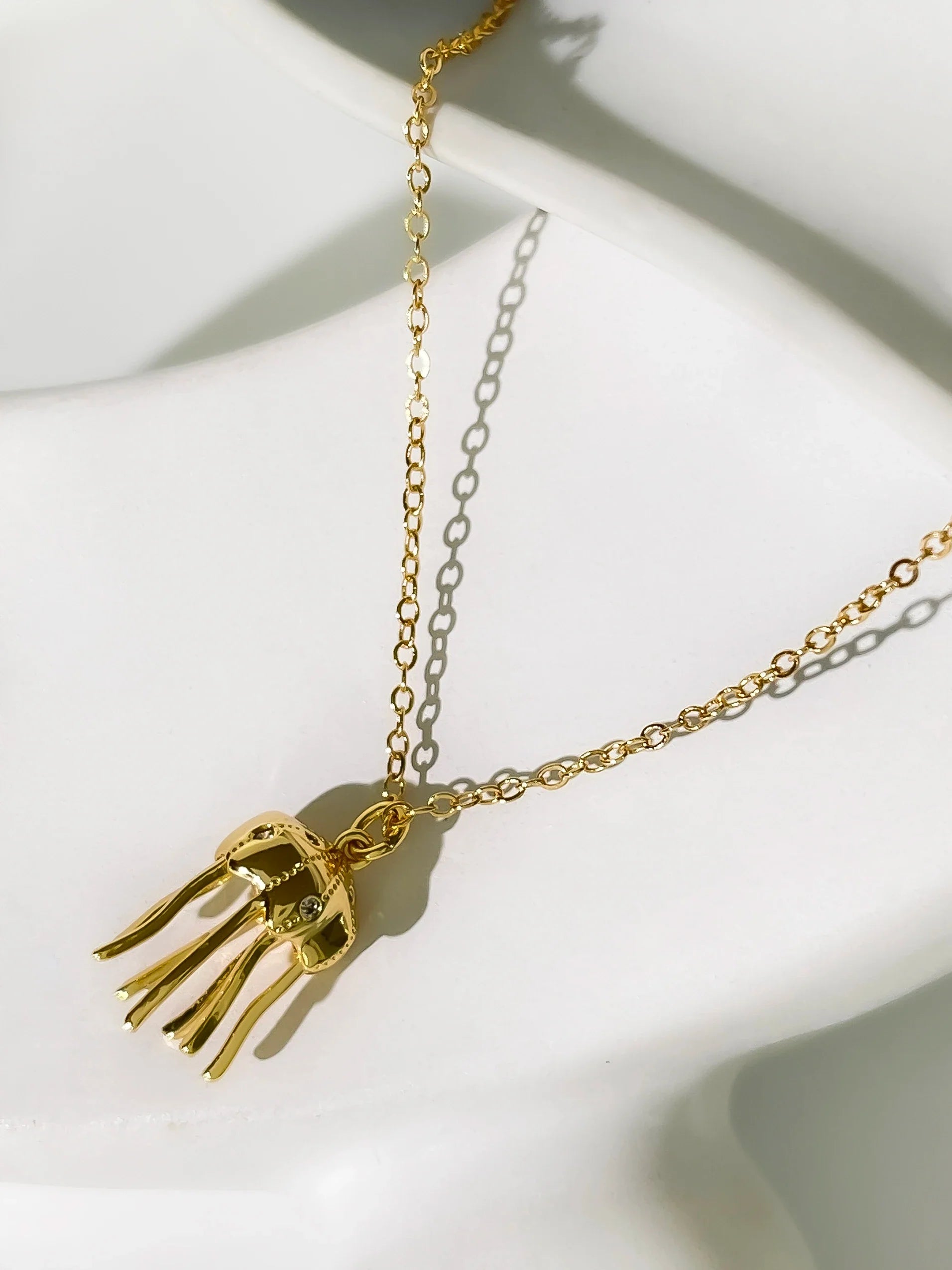Add some whimsy to your jewelry collection with our 18K Gold Plated Jellyfish and Octopus Freshwater Pearl Necklace. This quirky design features an elegant jellyfish and an octopus holding a lustrous freshwater pearl. Made with high-quality materials. these necklaces are unique and playful statement pieces for any occasion.Â