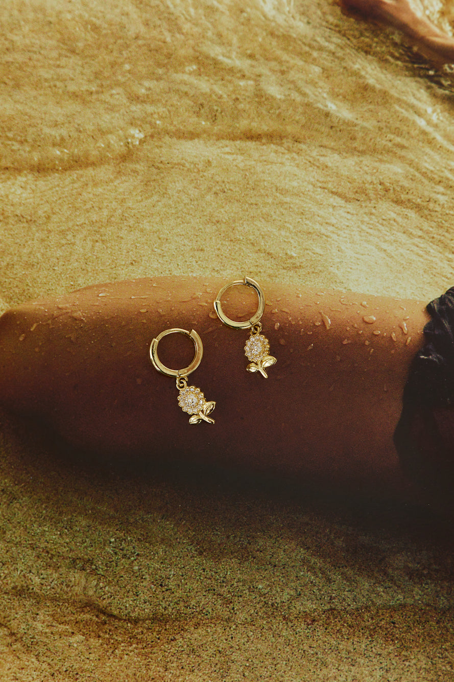 Be as beautiful as Opalescent Roses with these maginificent earrings. Created with a small rose shaped drop on a gold hoop - making it ideal for every elegant night out!Â