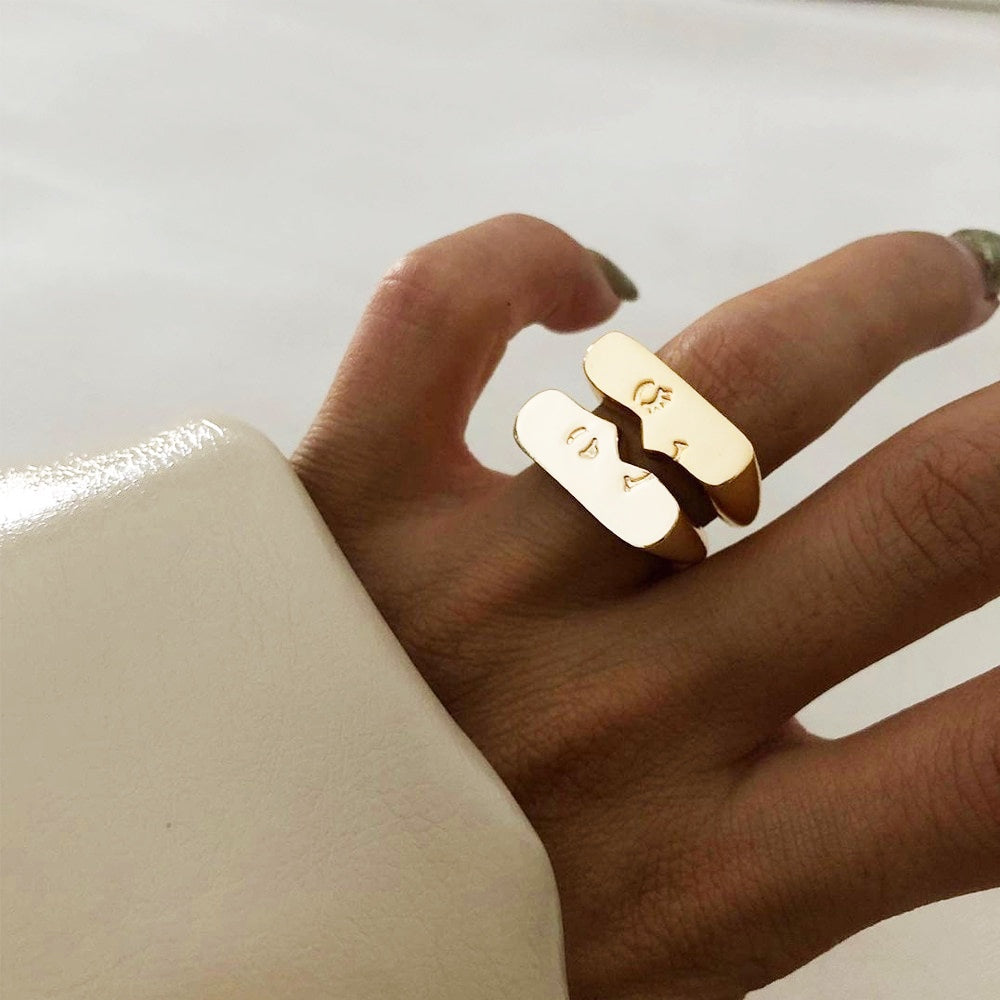 Abstract Face Pair Minimalist Ring Set - Silver or Gold. Popular minimalist face figure ring set with a couple with matching half faces. Adorable as it is or wear alone or together on one finger or different fingers - be creative.