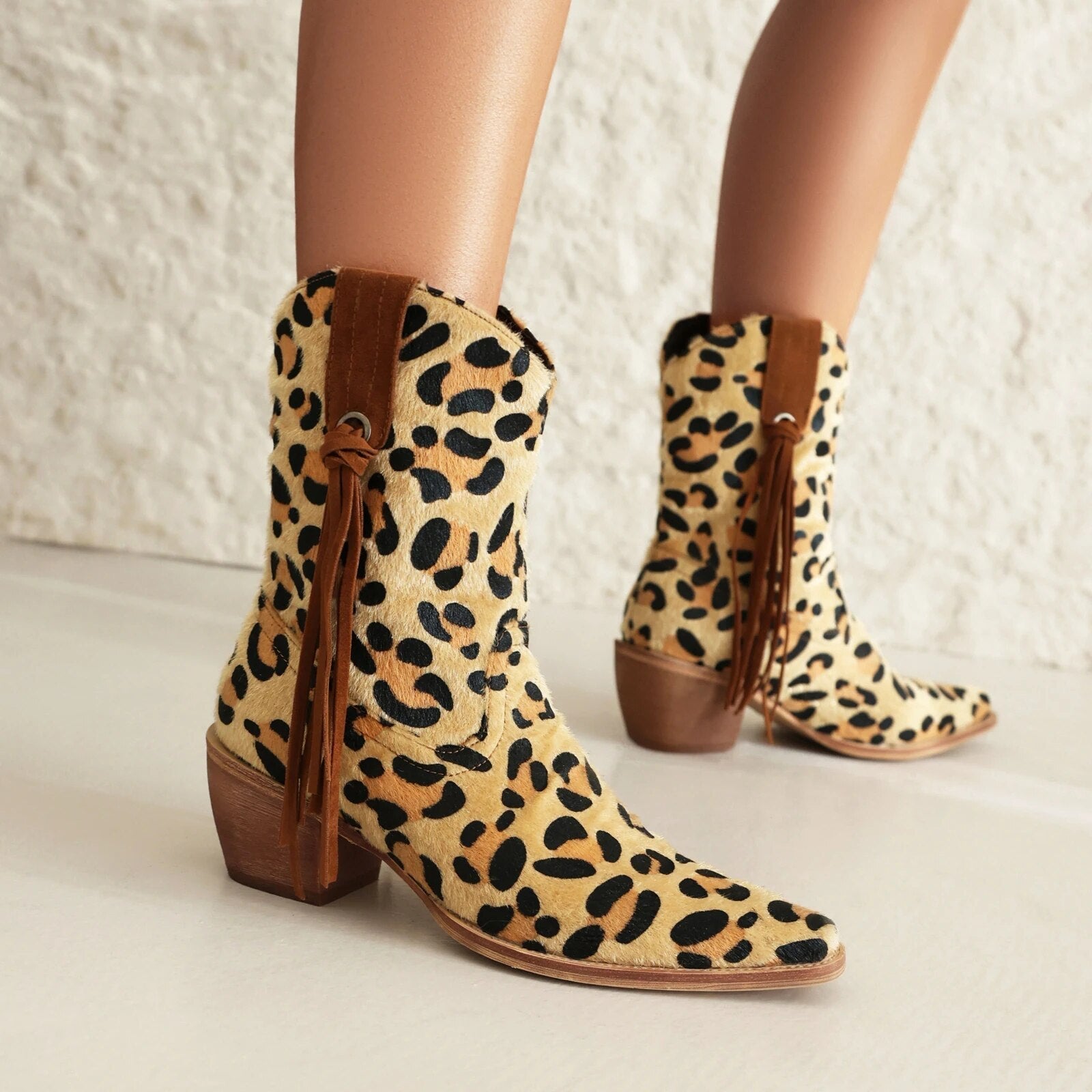 Step out in style with these Aine Faux Cowhide Western Chelsea Boots. Made with faux cowhide for a genuine western look in our favorite animal prints. these boots feature a sleek and modern silhouette. Perfect for adding a bit of oomph to any outfit with tassel finish! Put your best foot forward! Â Please allow 3-5 days for production.
