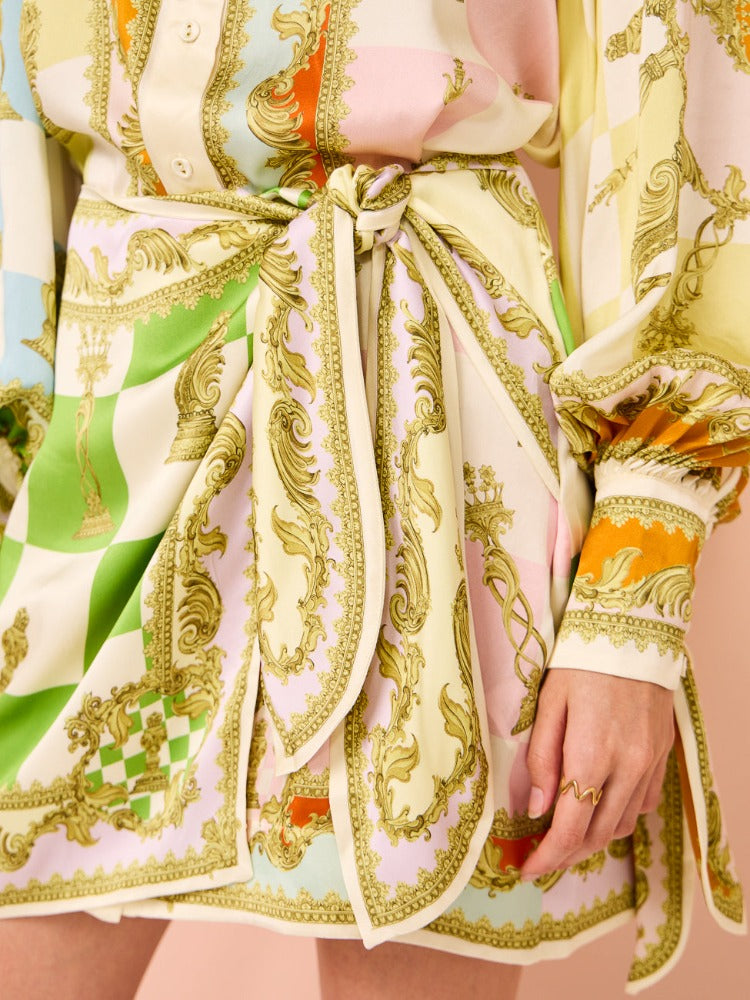 Crafted from a silk fabrication. this mini dress features a relaxed shirt silhouette. point collar and wrap skirt with a self tie side.