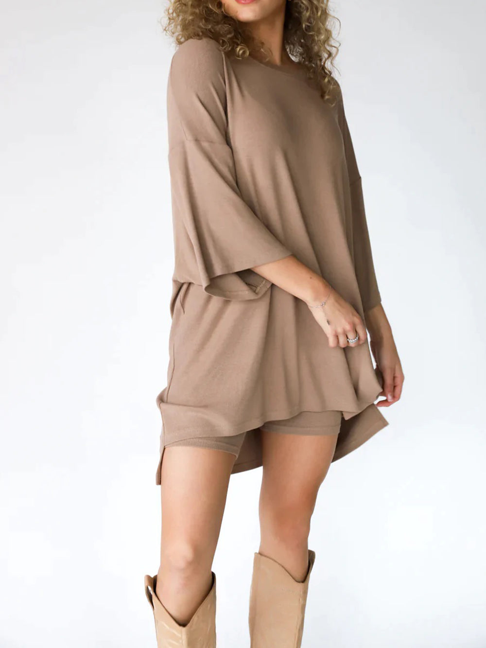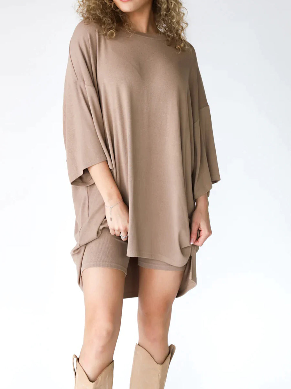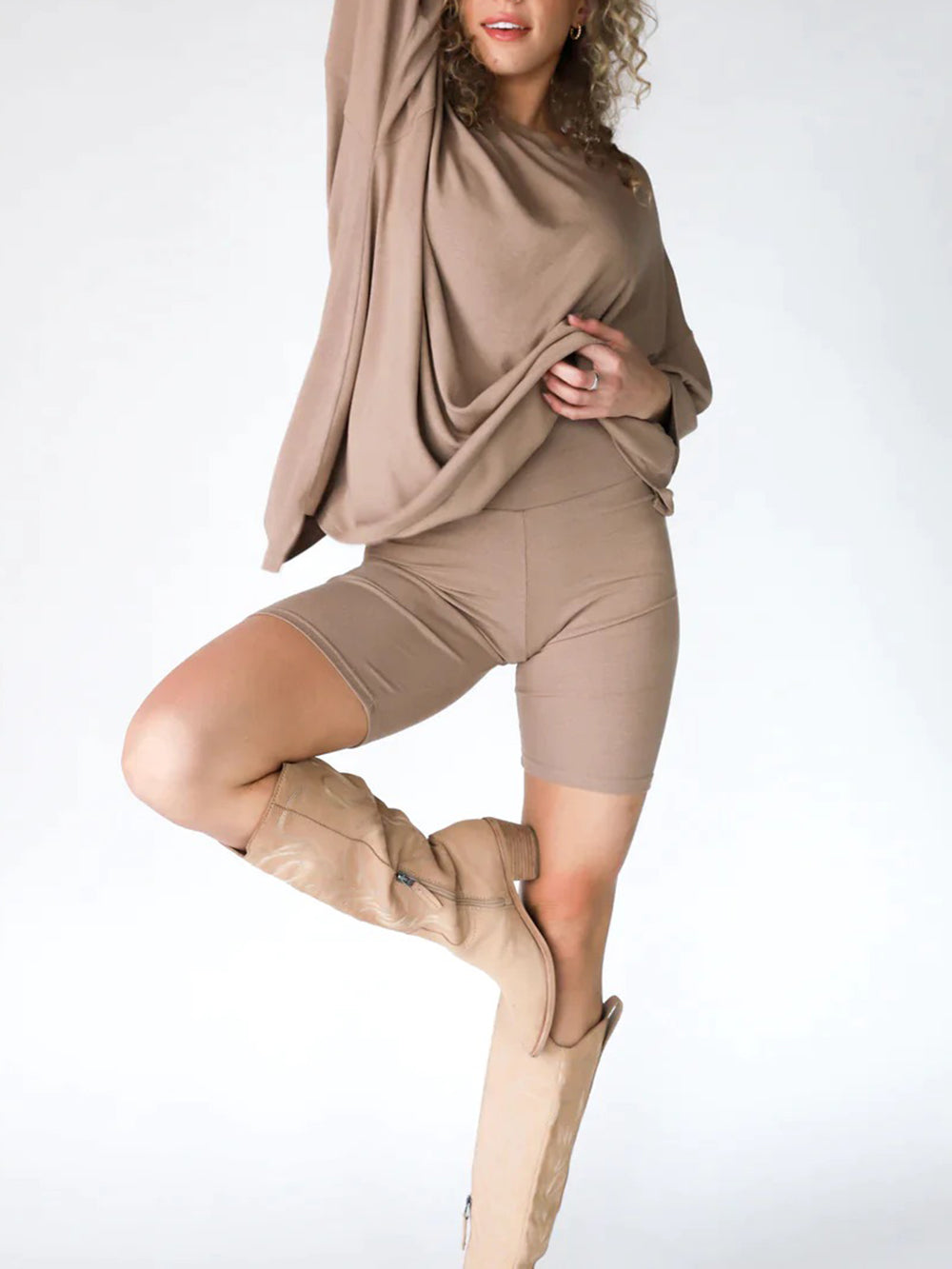 This oversized boyfriend tee comes with a pair of matching biker shorts.