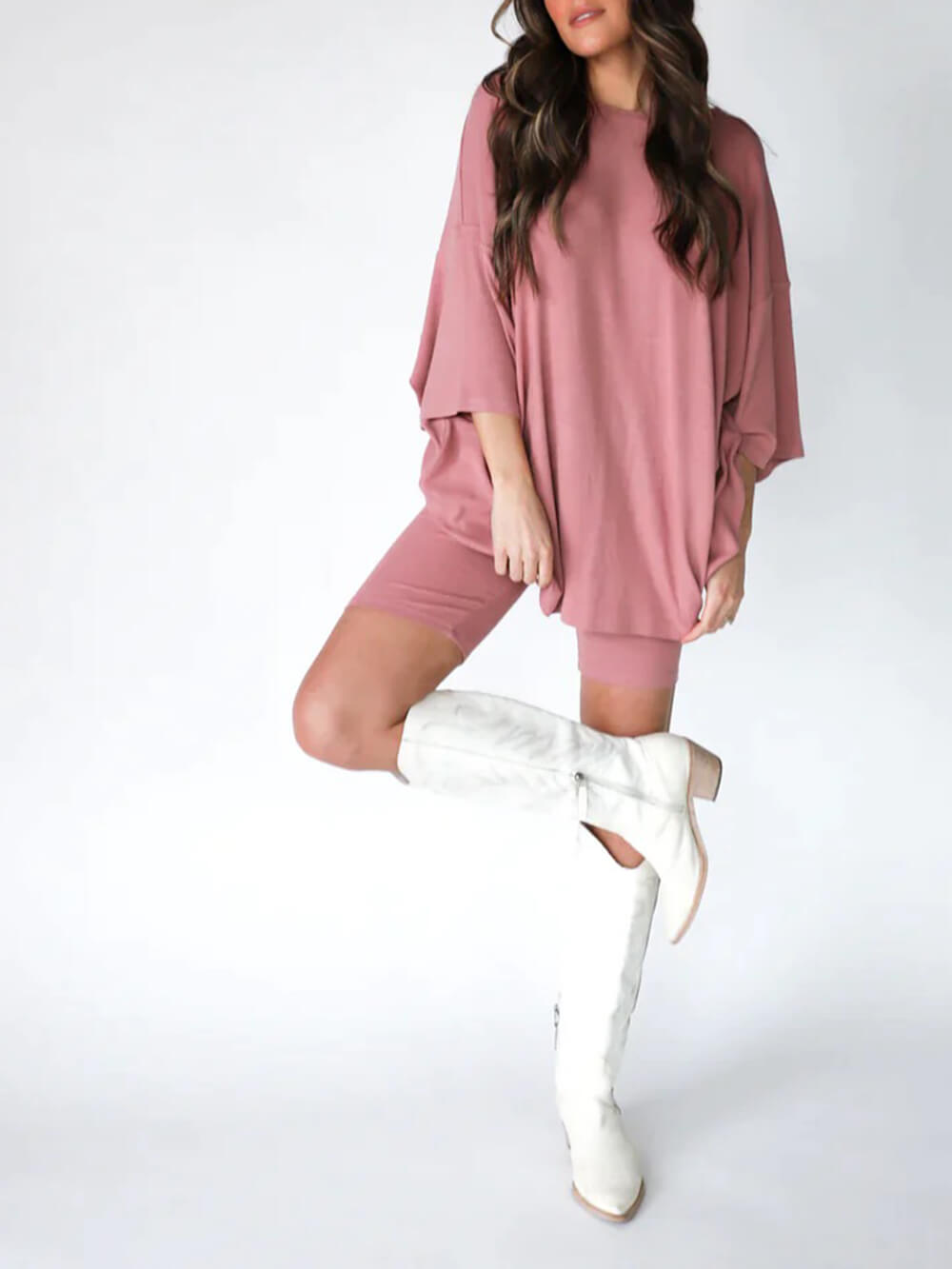 This oversized boyfriend tee comes with a pair of matching biker shorts.