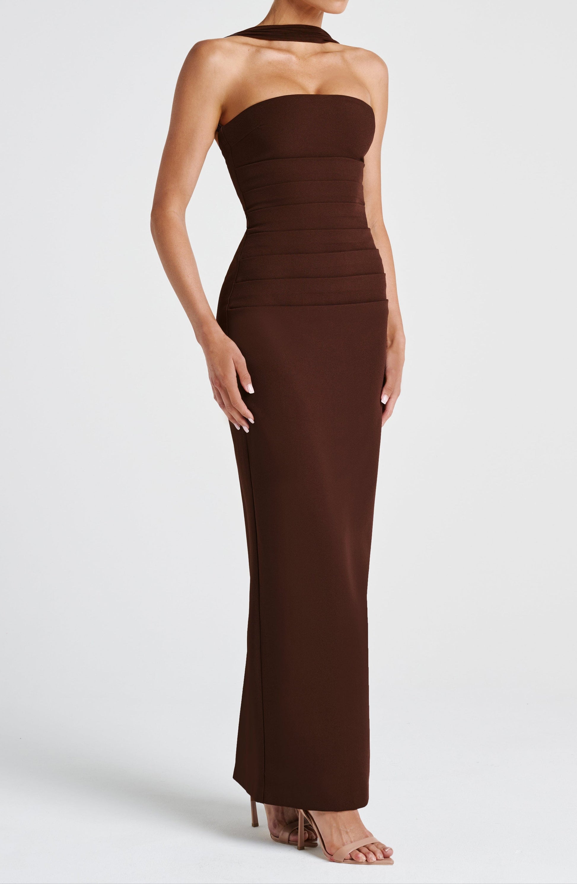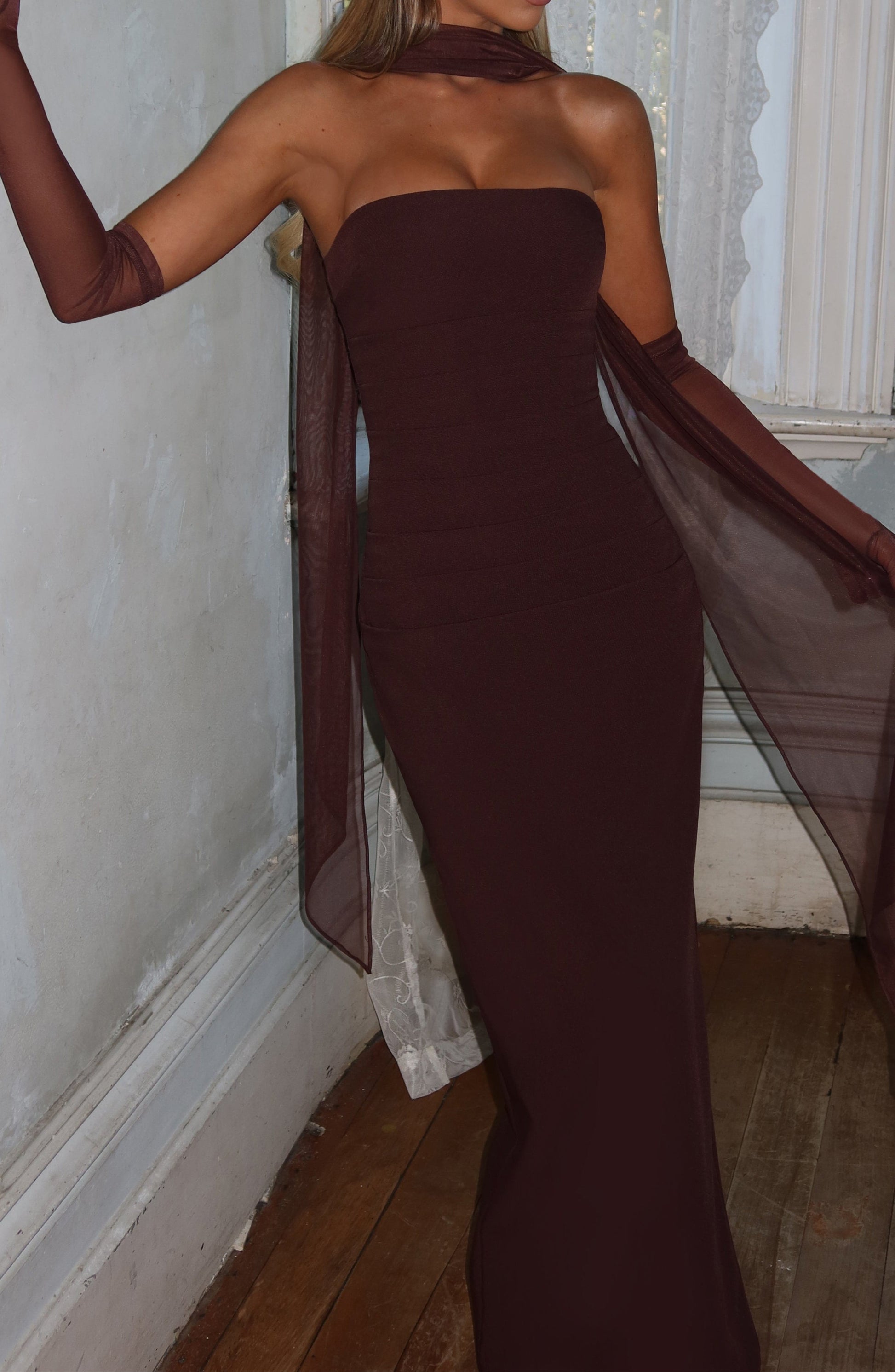 Chic & Complete Ensemble ââ‚?Pair the Yulia Maxi Dress with the Eli Gloves for a coordinated. high-fashion statement. The deep Plum Brown hue and refined details make it a standout piece for weddings. galas. or any occasion where you want to make an unforgettable impression.
