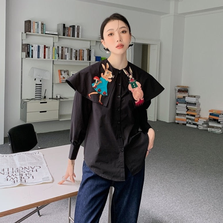 Annabella Rabbits Embroidered Shirts. Really lovely embroidery shirts with cute sailor collar across the back details. Slight lantern sleevs with three quarter sleeve length. Casual and fun to wear and a good conversation starter. If you are rabbit lovers. it is a must have.