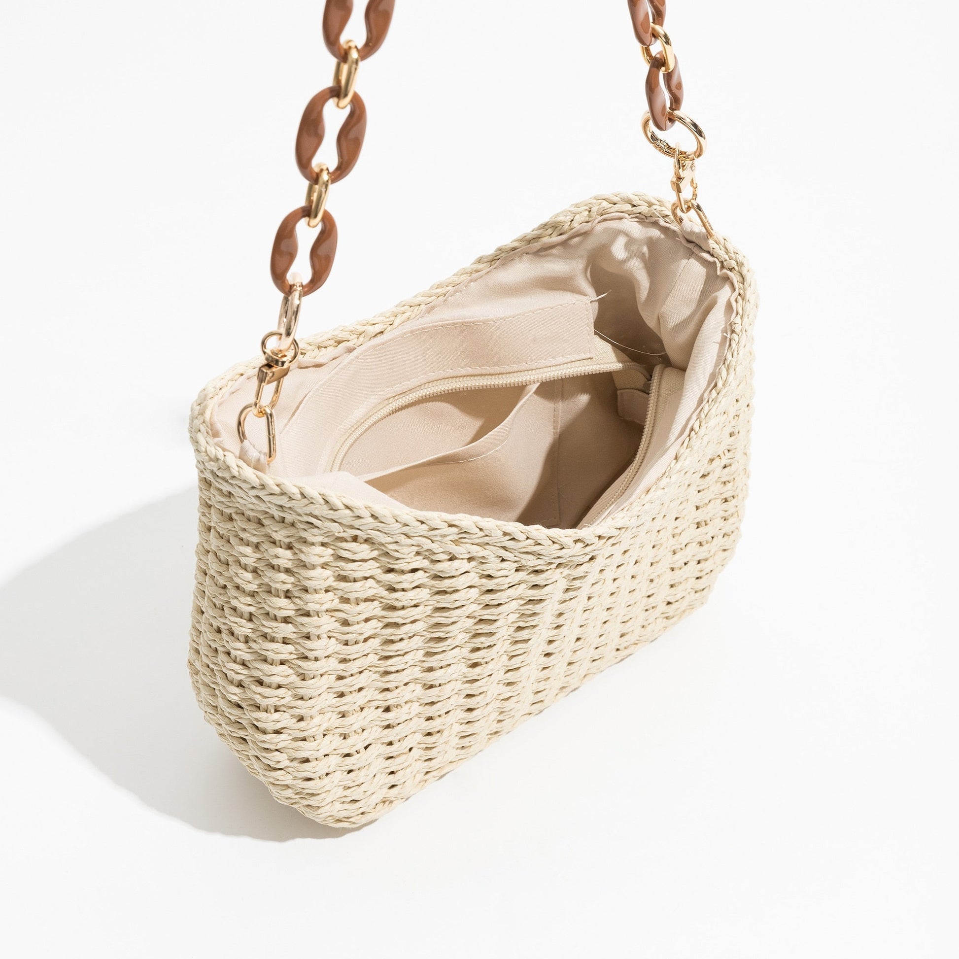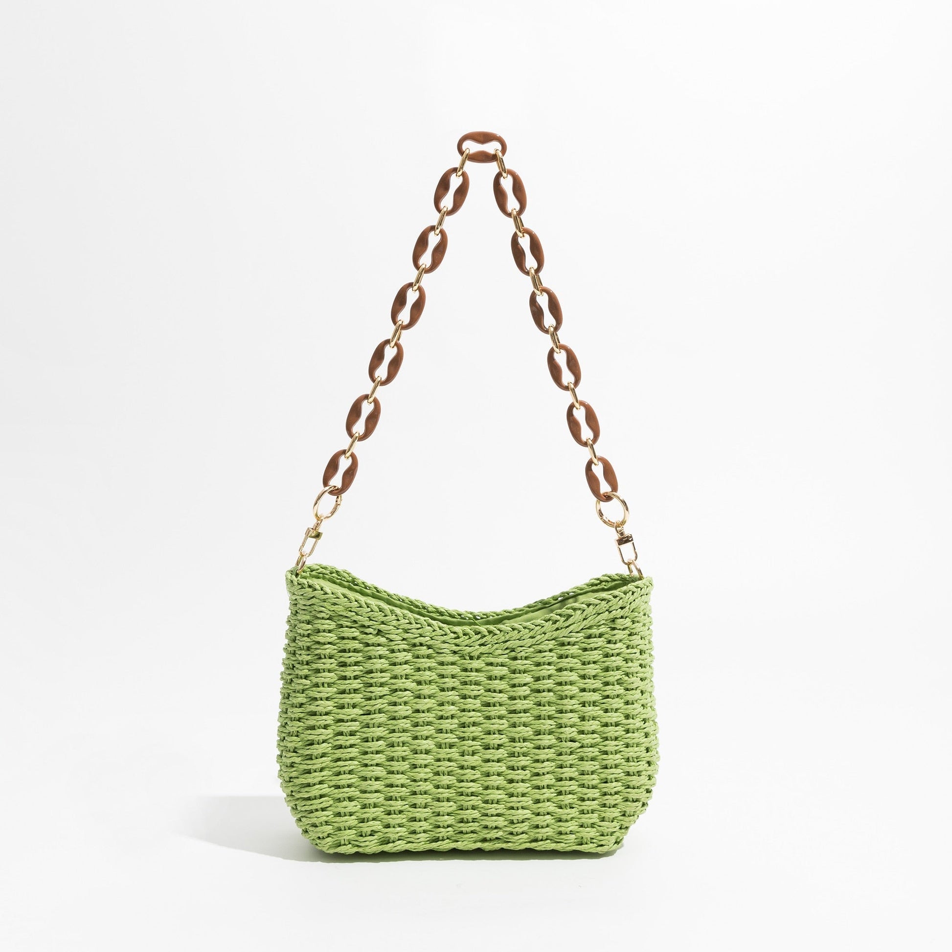 Annalise Straw Mini Shoulder Bag - 6 Colors. Â Cute baguette bag style in woven straw with beautiful resin chain link strap. Comes in 6 pretty pastel colors.
