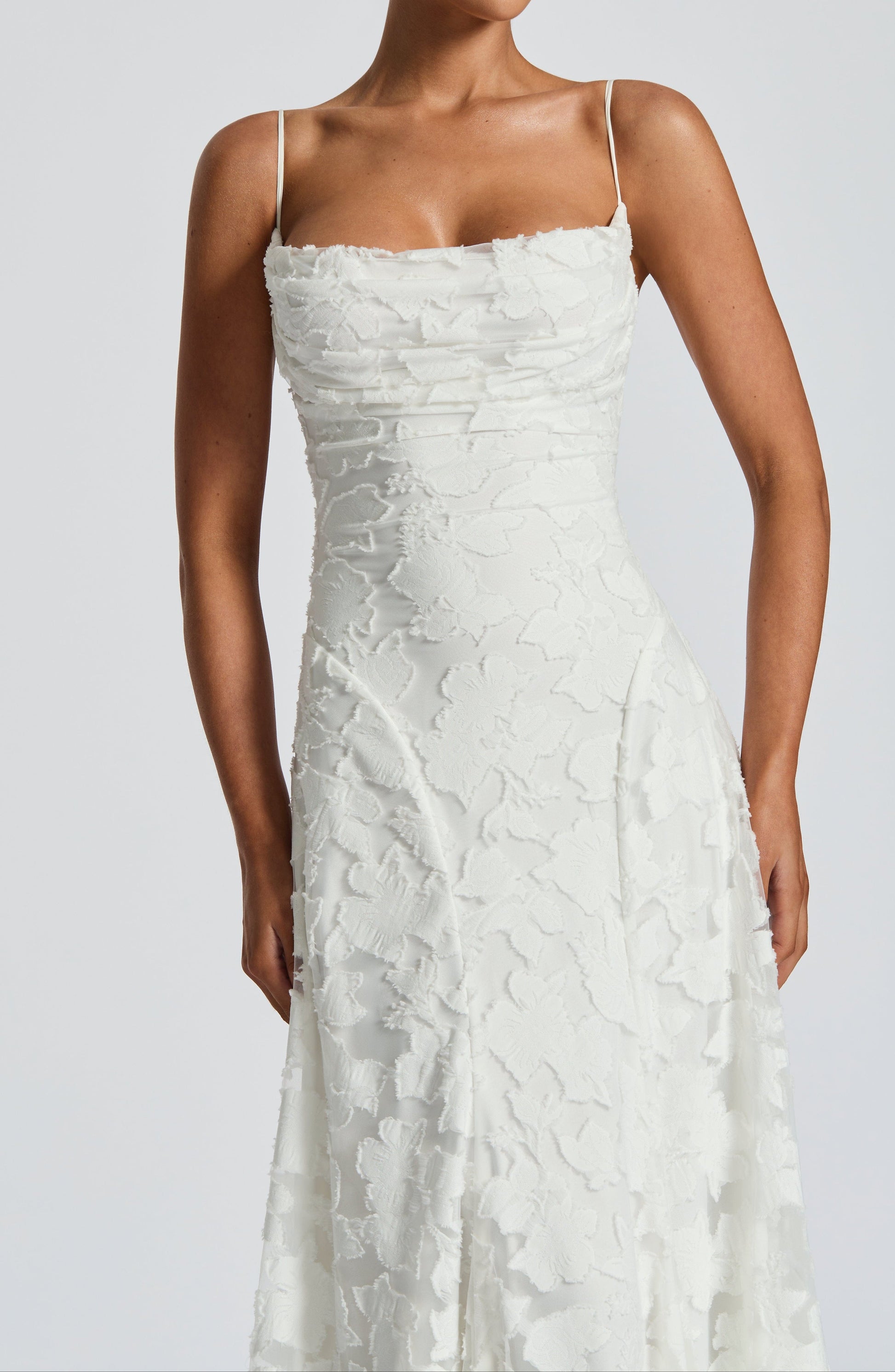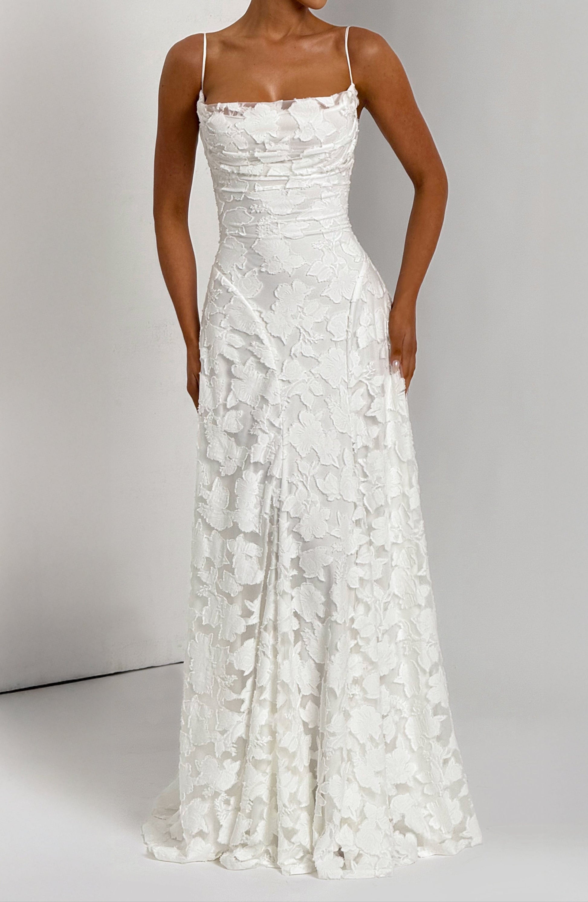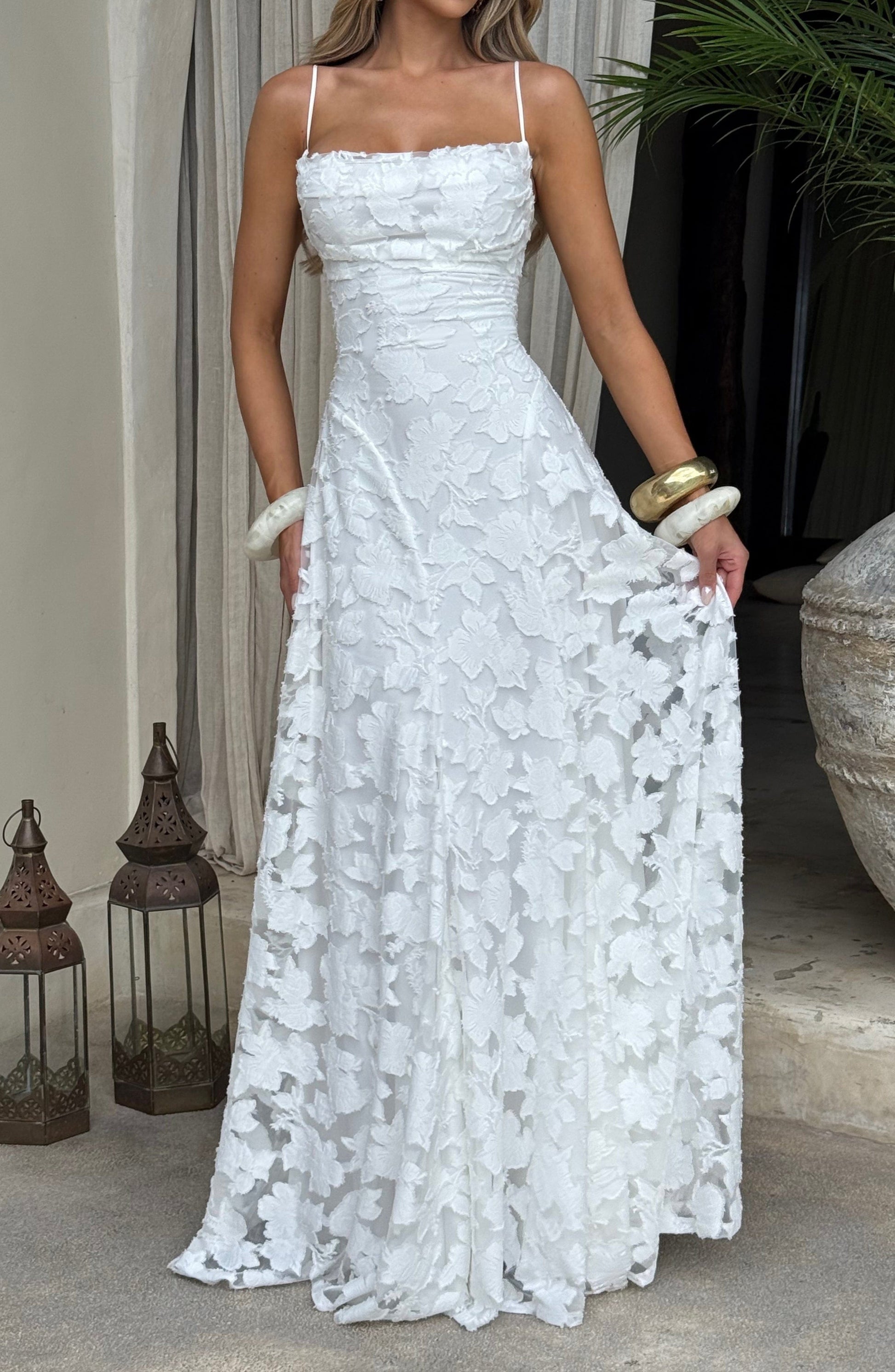 Make a stunning impression in this beautifully crafted maxi dress. featuring a custom floral burnout jersey fabric that exudes effortless sophistication. The flowing silhouette. delicate cowl neckline. and lace-up back create a perfect balance of romance and modern allure.