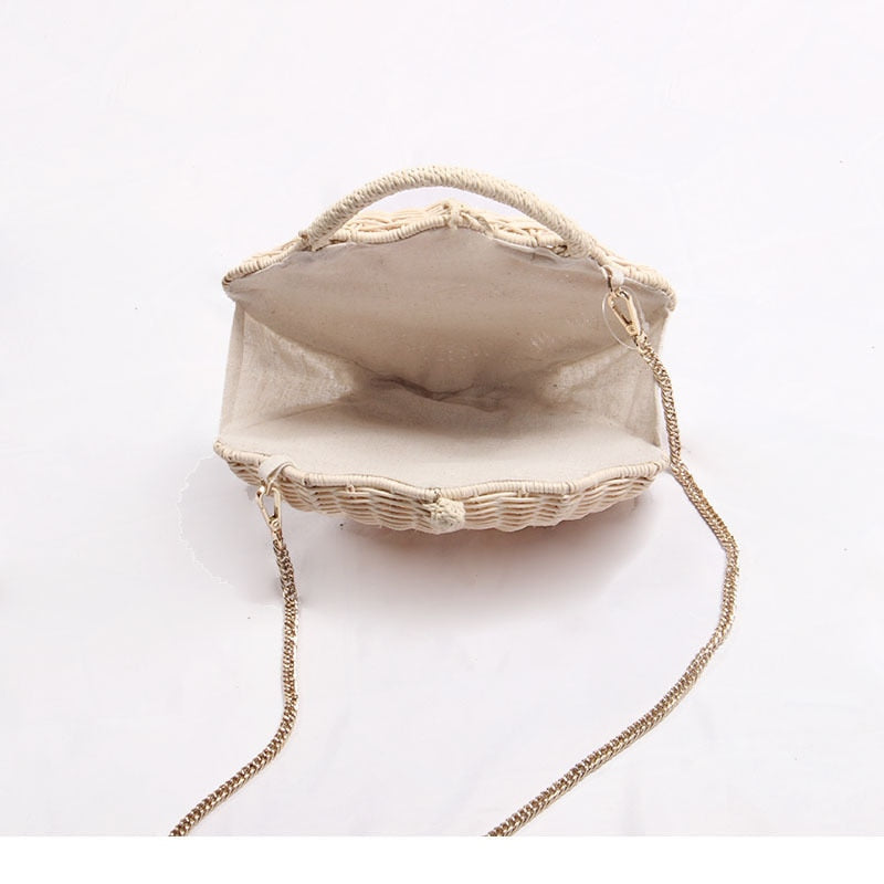 Ark Seashell Straw Rattan Shoulder Chain Bags - 2 Styles. Gorgeous ark seashell shaped ratten bag with top handle with shoulder chains. Fabric lined. Beautifully shaped. Comes in Rattan or Straw versions.Â