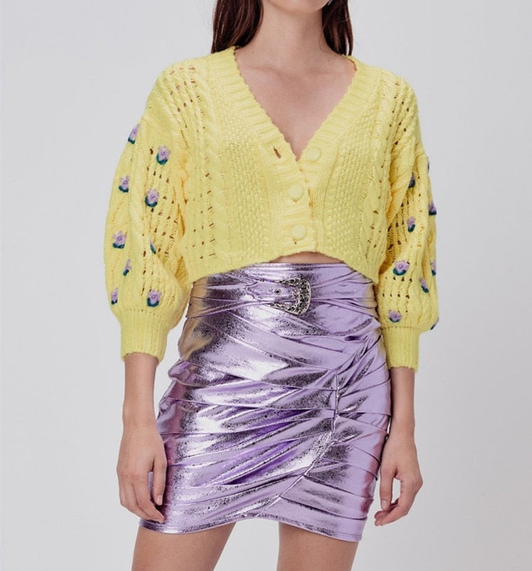 Asta Vintage Puff Sleeve Flower Cable Knit Cardigan