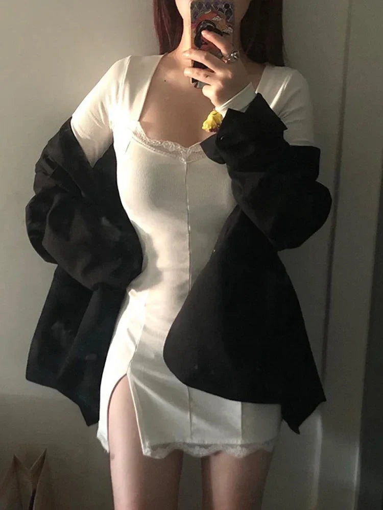 Autumn Spring Lace Patchwork Split Mini Low Midi Dresses