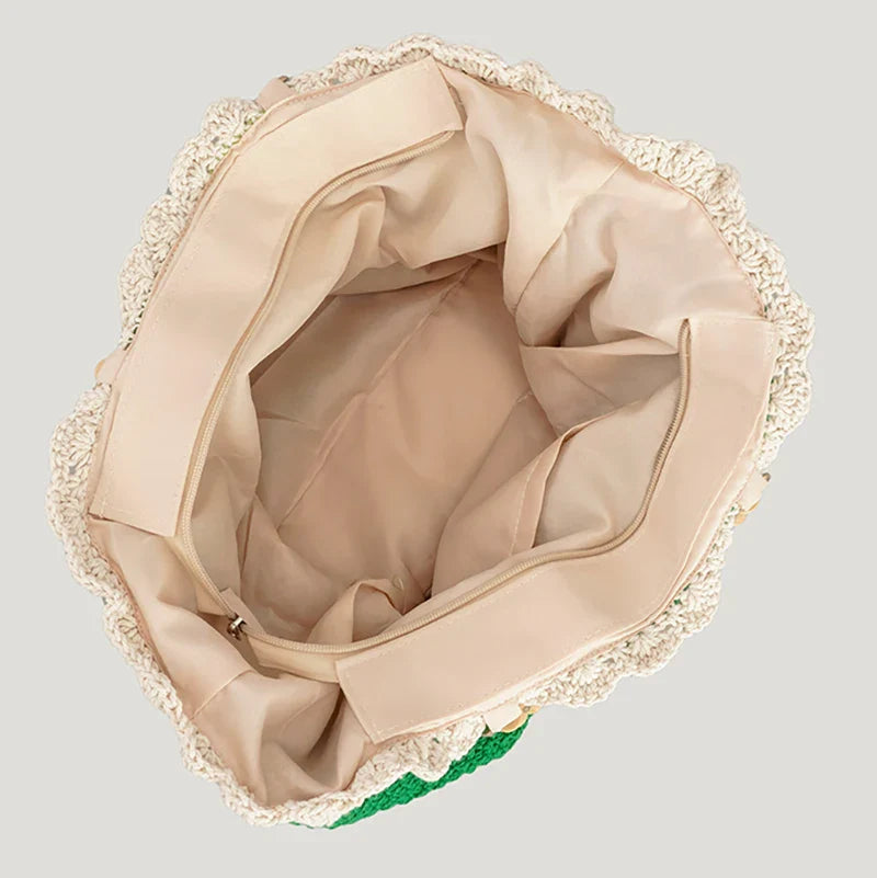 Get ready to hit the beach. market or office(!) with our Bahar Bohemian Crochet Tote Bag! With a stylish bohemian crochet design and bamboo shaped handle. this bag is perfect for carrying all your essentials. Show off your fun. carefree side with this full of bohemian spirit and playful tote. (No boring totes allowed!)