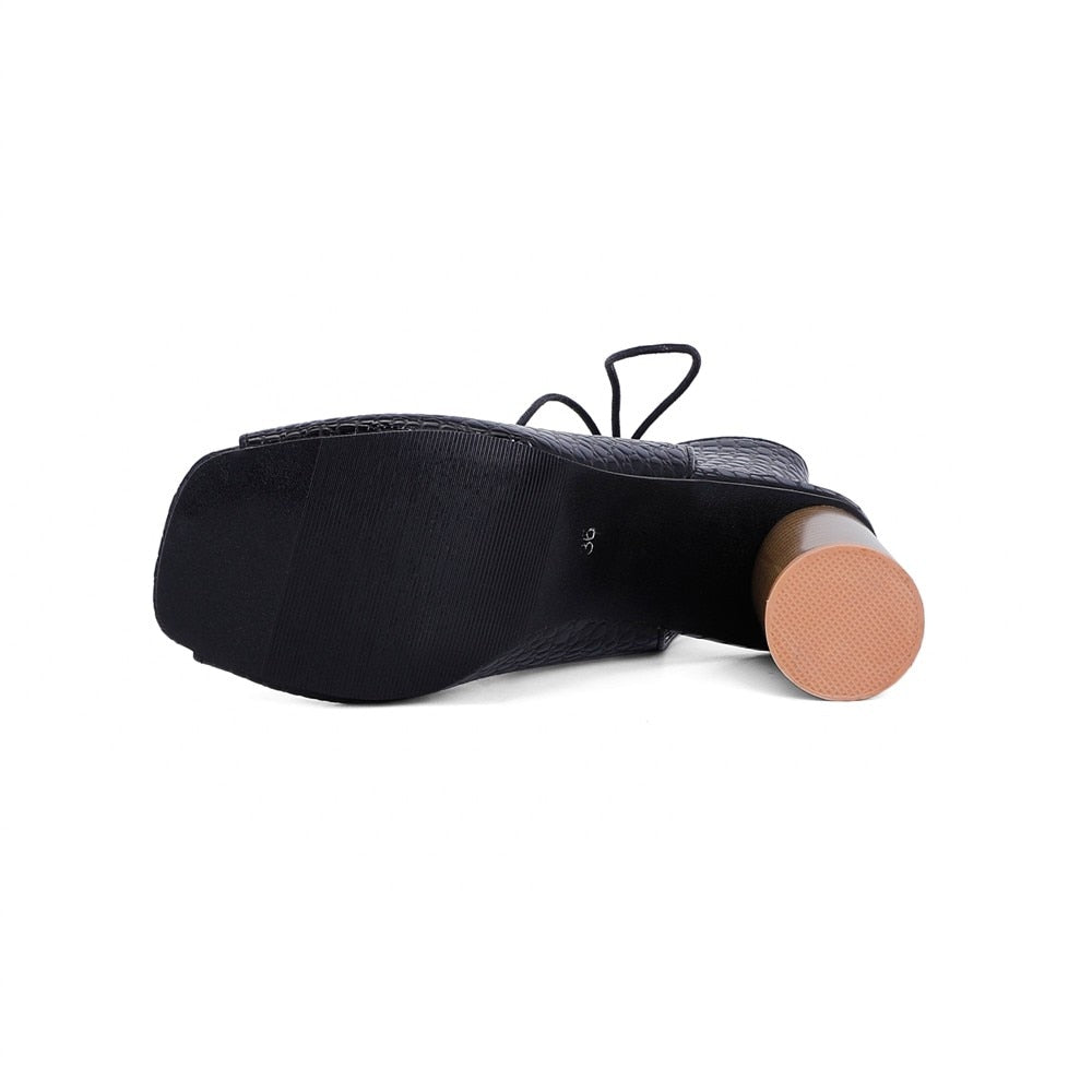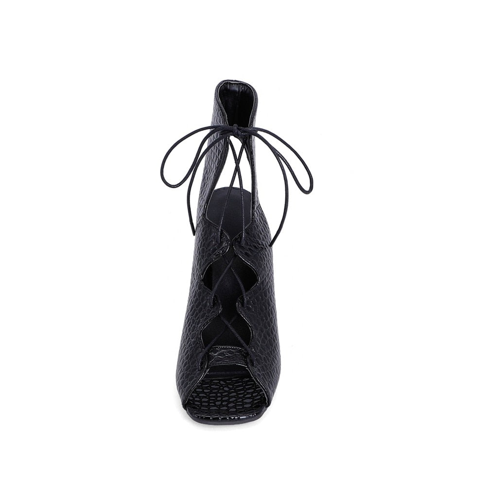 Bethany Animal Prints Gladiator Lace-Up Heels - 4 Colors. Stylish peep toe and gladiator lace up front sandals in cool croc and snakeskin animal prints. Interesting round pillar heels design.