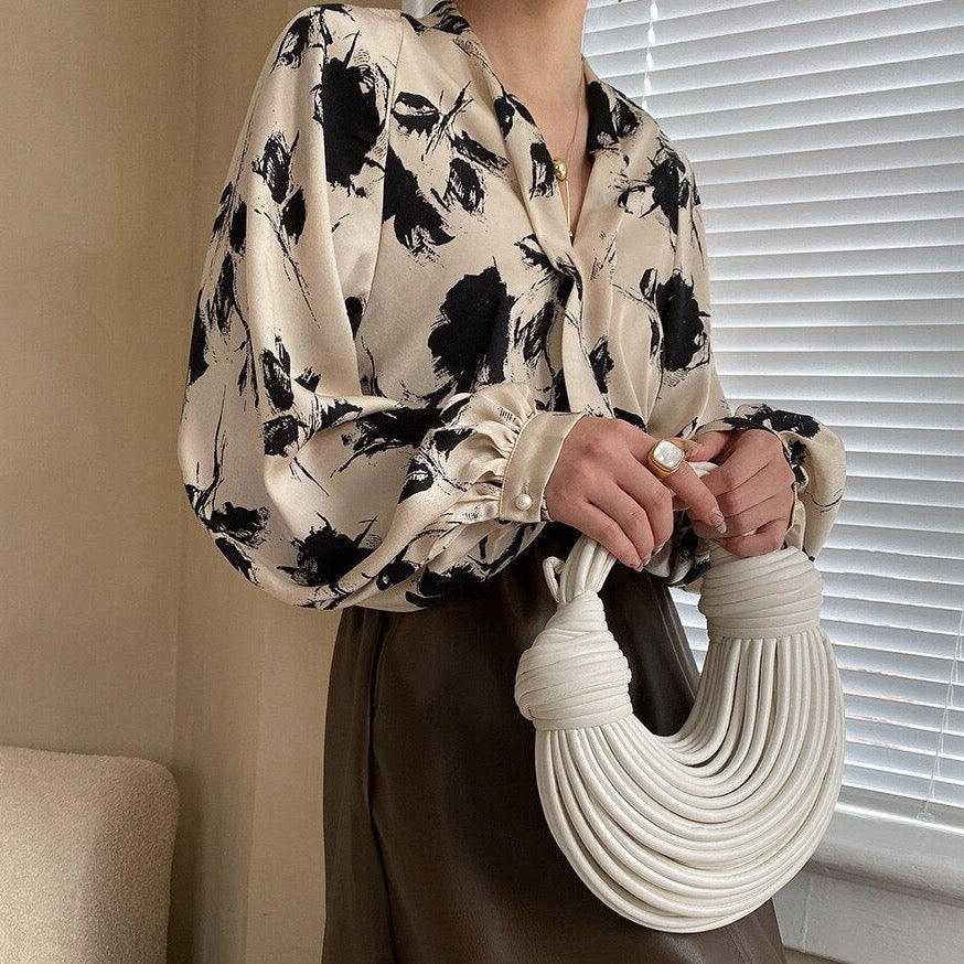 Bianca Black Floral Print Blouse - 3 Colors. Beautiful elegant brush stroke floral prints midweight satin blouse. Collarless V-neck with neatly gathered panel front is so lovely.Â