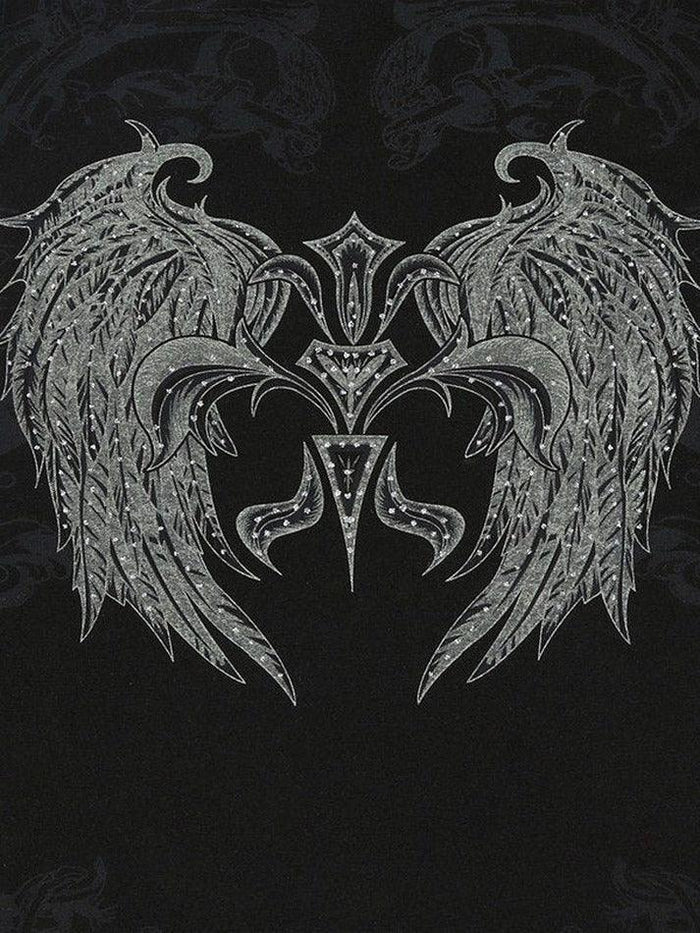 Black Grunge Rhinestone Decor Wing Printed Crop Top