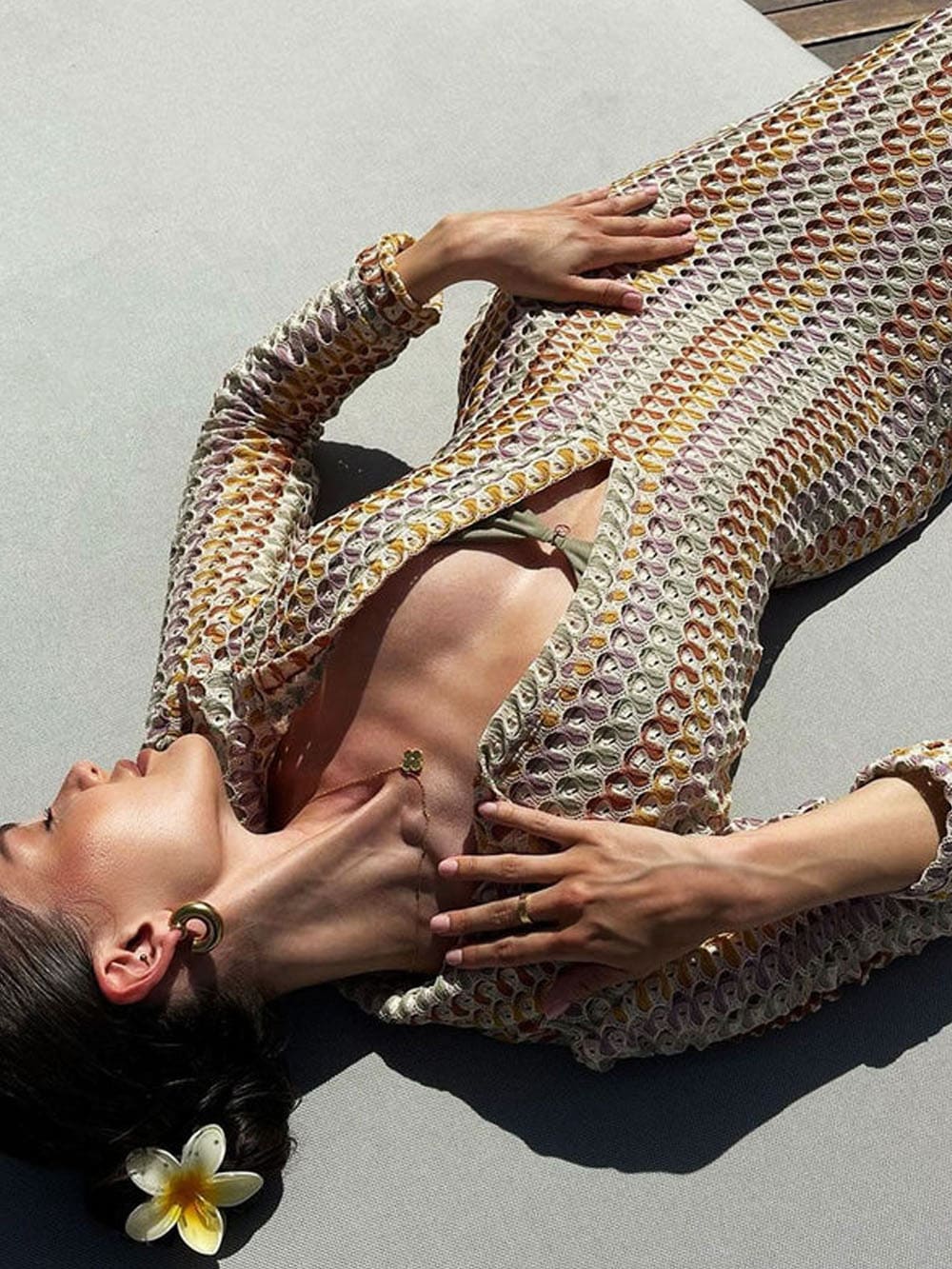 Transport yourself to the carefree ambiance of a vacation with our boho chic style crochet dresses for women. This collared maxi dress in our boutique encapsulates the easygoing and cheerful holiday vibe. offering a blend of chic style and relaxed comfort. The collared V neck and alluring keyhole cutout create an air of playful sophistication. complemented by the whimsical wavy striped crochet design and charming split sides. allowing you to revel in the soothing beach breeze. Experience the pure delight of a stylish and carefree escape as you unwind in this delightful and free-spirited vacation outfit.