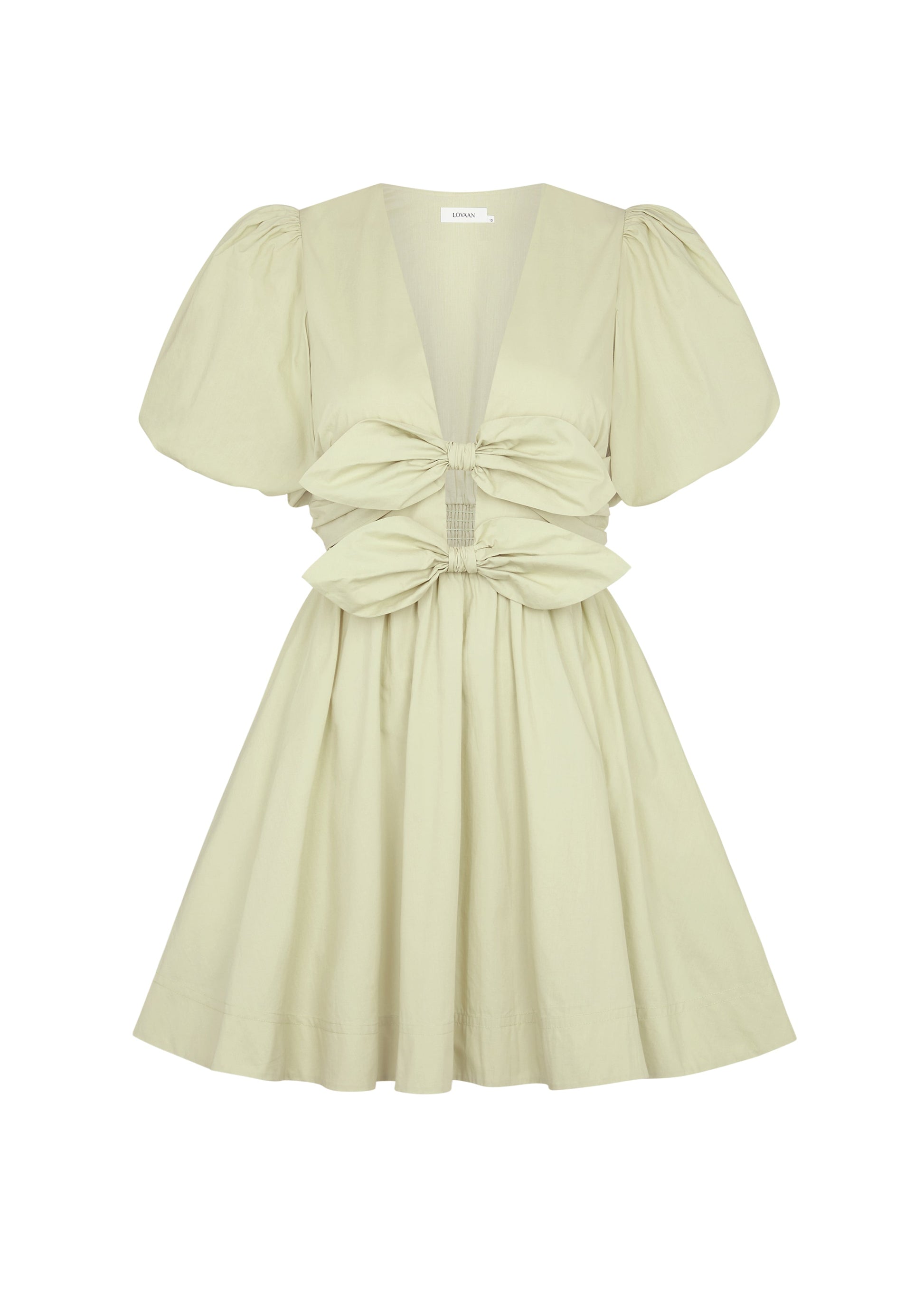 The Devon mini dress in pistachio is made from butter-soft cotton poplin. featuring double bow front details. blousy puff sleeves and a flattering deep V-front neckline.
