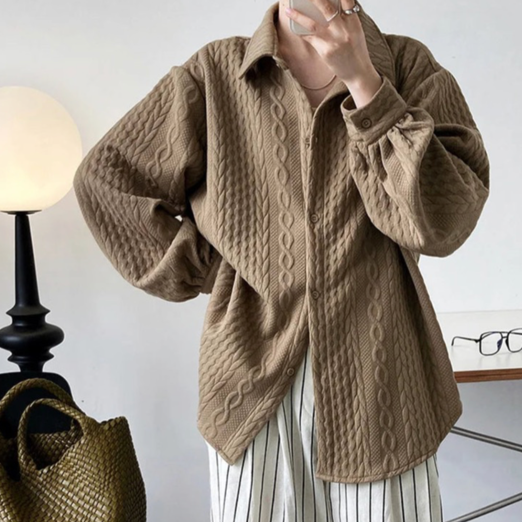 Get cozy in style with our Cable Knit Textured Cotton Shirt Blouse. This unique top features a midweight cable knit texture. shirt front and slight balloon sleeve of blouse. adding depth and dimension to any outfit. Sometimes. all the good things could happen all at the same time!