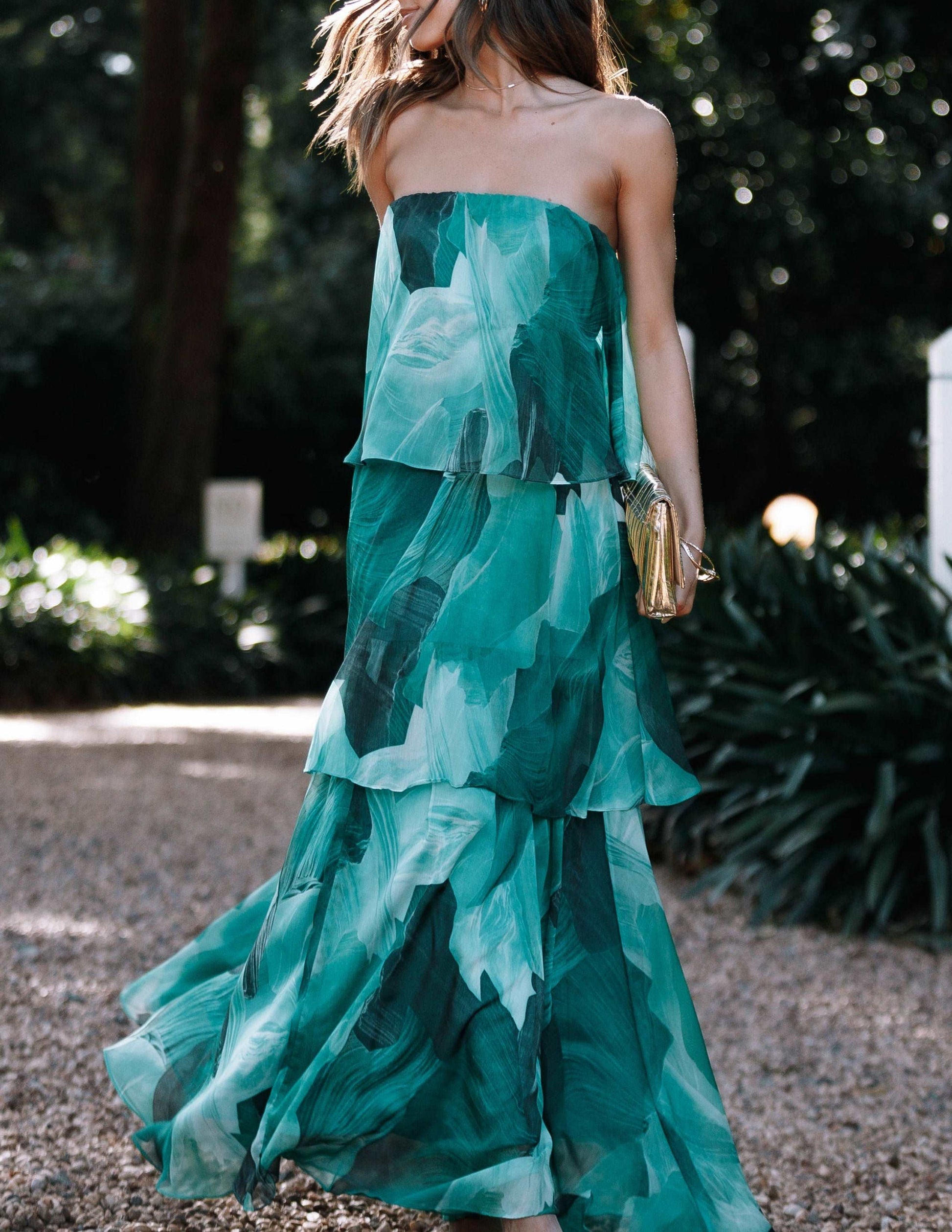 Calista Green Bloom Strapless Tiered Maxi Dress