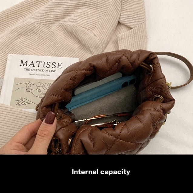 Cecila Quilted Pouch Mini Tote Bag - 3 Colors. Pretty pretty little quilted leather pouch bag with big chain handle and leather braided shoulder strap. Classic luxe and chunky chain details for trendy look at the same time. Don't you need this bag right now? 3 lovely colors to love.