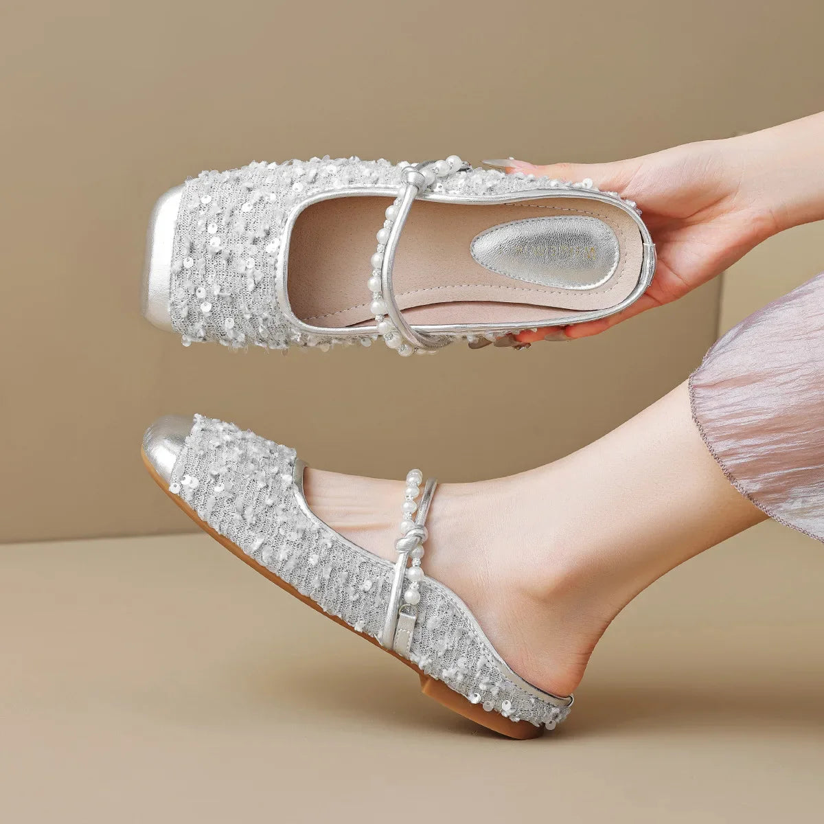 Turn any outfit into a party with Chantelle Sequin Tweed Mules. These playful and quirky mules feature shimmering sequins in unique tweed material. metallic trim and pearl beads strap. Perfect for adding a touch of mermaid charm to your look. Step into fun and comfortable style with Chantelle.