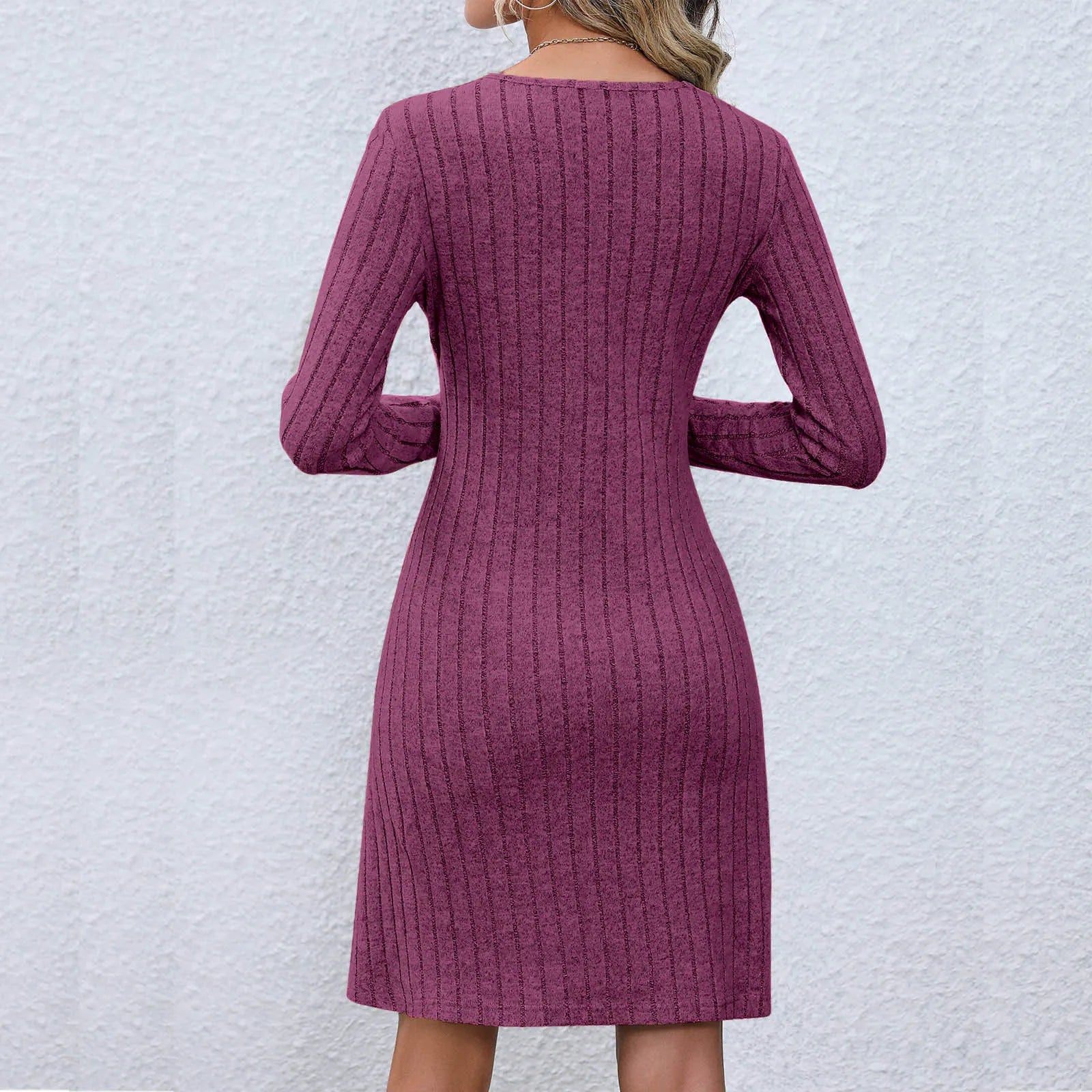 Chic V-Neck Buttoned Waist Long Sleeve Solid Color Midi Dress