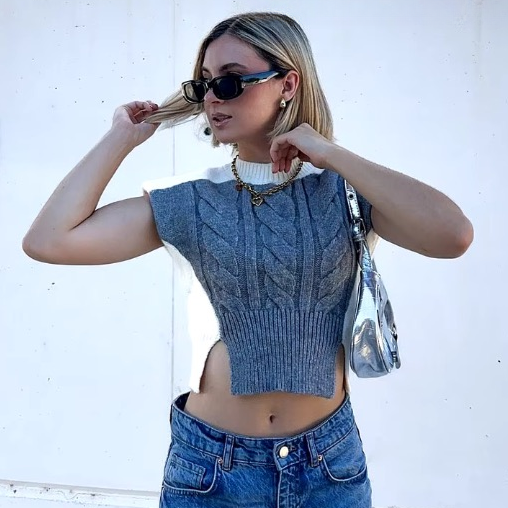 Meet Chiyo. the ultimate color block cable knit vest! Stay cozy while standing out in this playful and stylish piece. Perfect for layering and adding a pop of color to any outfit. perfectly cropped.