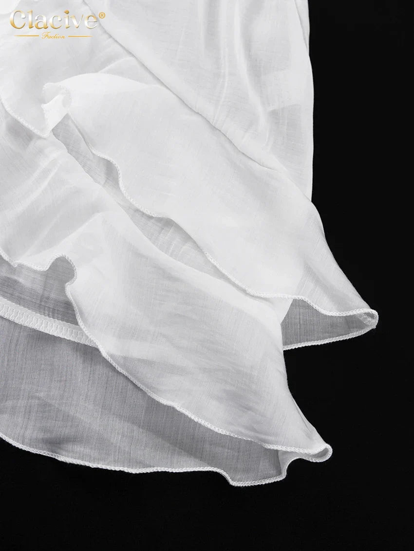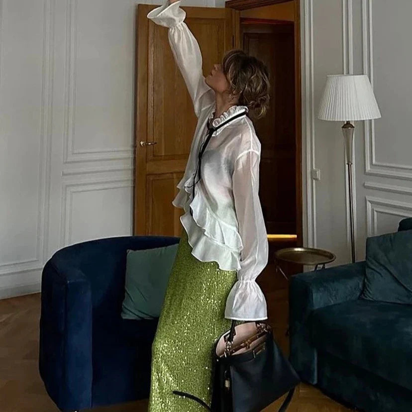 Add a touch of whimsy to your wardrobe with the Chloe Frill Victorian Ruffle Blouse. Featuring charming Victorian-inspired frill stand collar with ribbon tie and ruffle sleeves. this blouse is perfect for the fashionista with a playful and quirky sense of style. Semi sheer. Stay on trend and stand out from the crowd with this unique and stylish blouse!