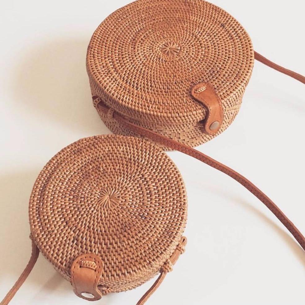 Circle Bohemian Rattan Shoulder Bag. Another style of circle rattan shoulder bag with leather strap and magnetic clasp. One of most popular circle rattan bags. Â Lined.Â