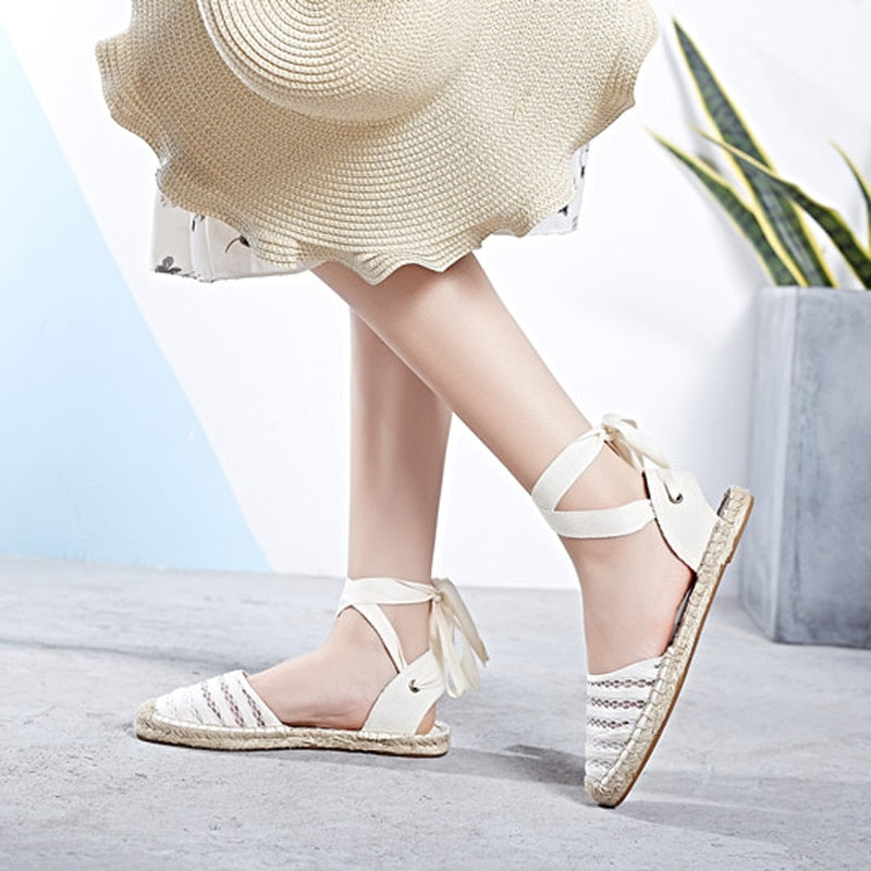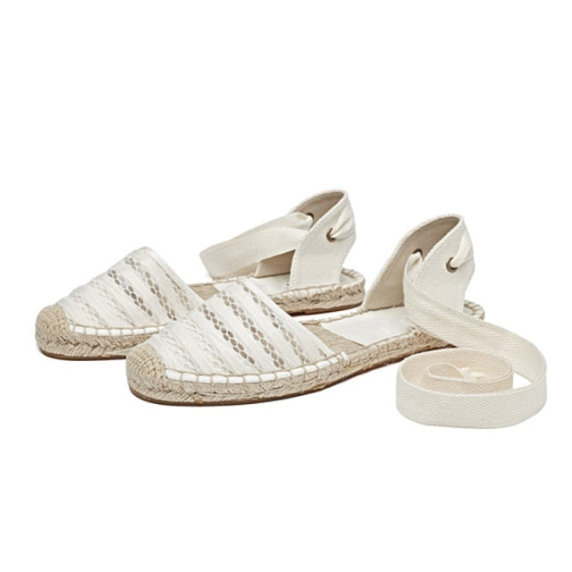 Lucia Lace Espadrille Sandals - 9 Styles. Beautiful natural cotton and lace upper espadrilles with race-up ribbons and natural hemp roped inner sole. 9 styles to choose from - Natural. lace and sequin pattern in a pretty spirit.