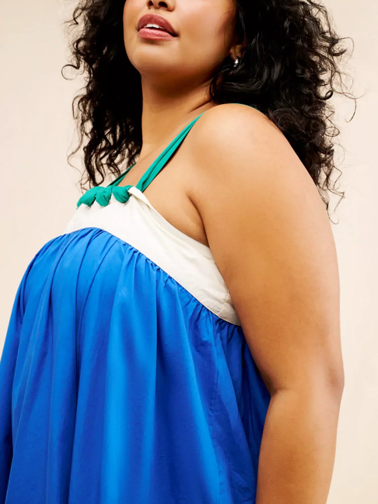 The dress features vibrant colorblock panels that radiate a playful charm. complemented by intricate stitching detail at the neckline. Its back tie closure not only ensures a perfect fit but also adds a touch of whimsy. Crafted with meticulous attention to detail. it effortlessly transitions from daytime adventures to evening gatherings with grace and comfort.
