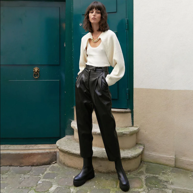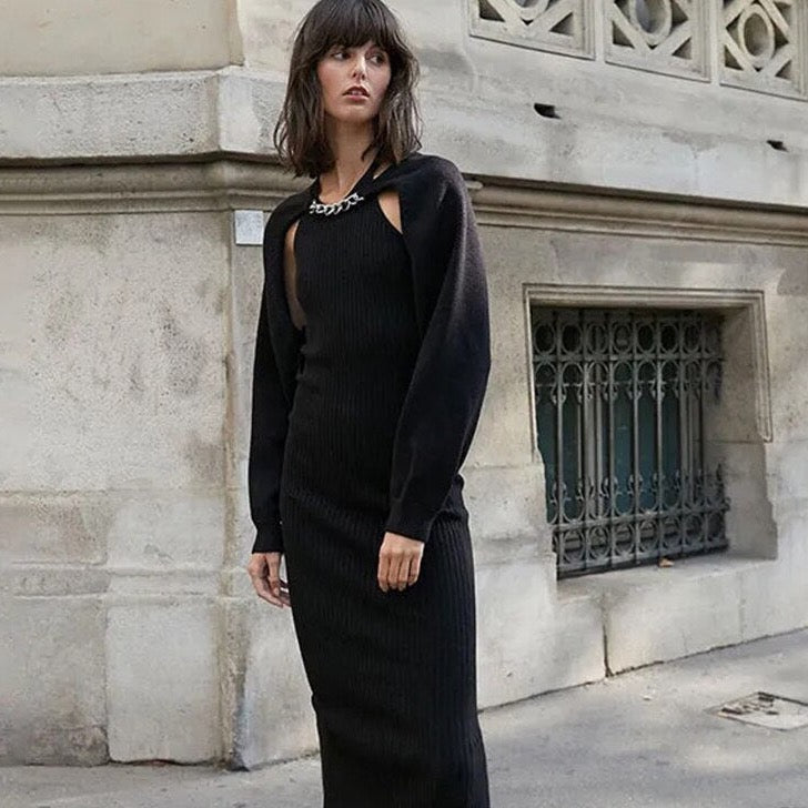Cropped Bolero Knit Sweater with Gold Choker. Cool cropped bolero knit sweater with bell sleeves and smock neckline. Gold chain details. Layer over tank or bra tops for both trendy and elegant looks.Â