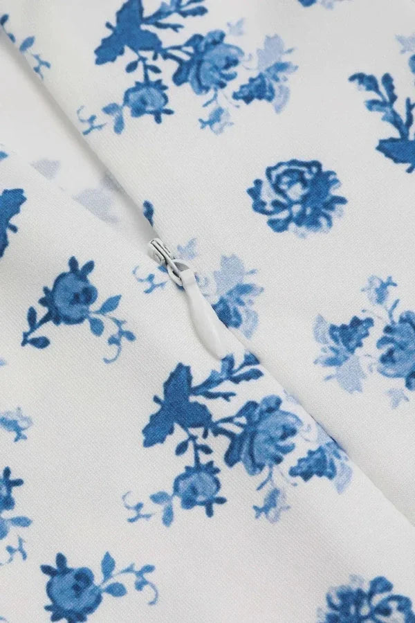 Turn heads in this dreamy floral corset maxi dress. designed to highlight your curves with its body-hugging fit and delicate detailing. The adjustable shoulder ties and soft blue blossom print lend a romantic touch. making it ideal for garden parties. elegant dinners. or a stroll through a summer meadow.