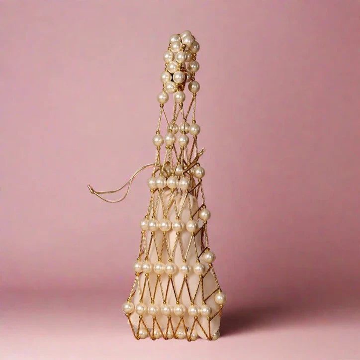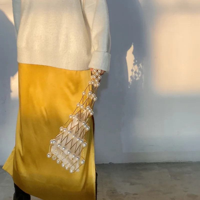 Indulge in elegance with our Dahlia Luxe Pearl Beads Gold Net Handbag. This exquisite bag features delicate pearl bead detailing on a luxurious gold net design. perfect for adding a touch of sophistication to any outfit. Elevate your style with this dazzling handbag that is sure to make a statement.