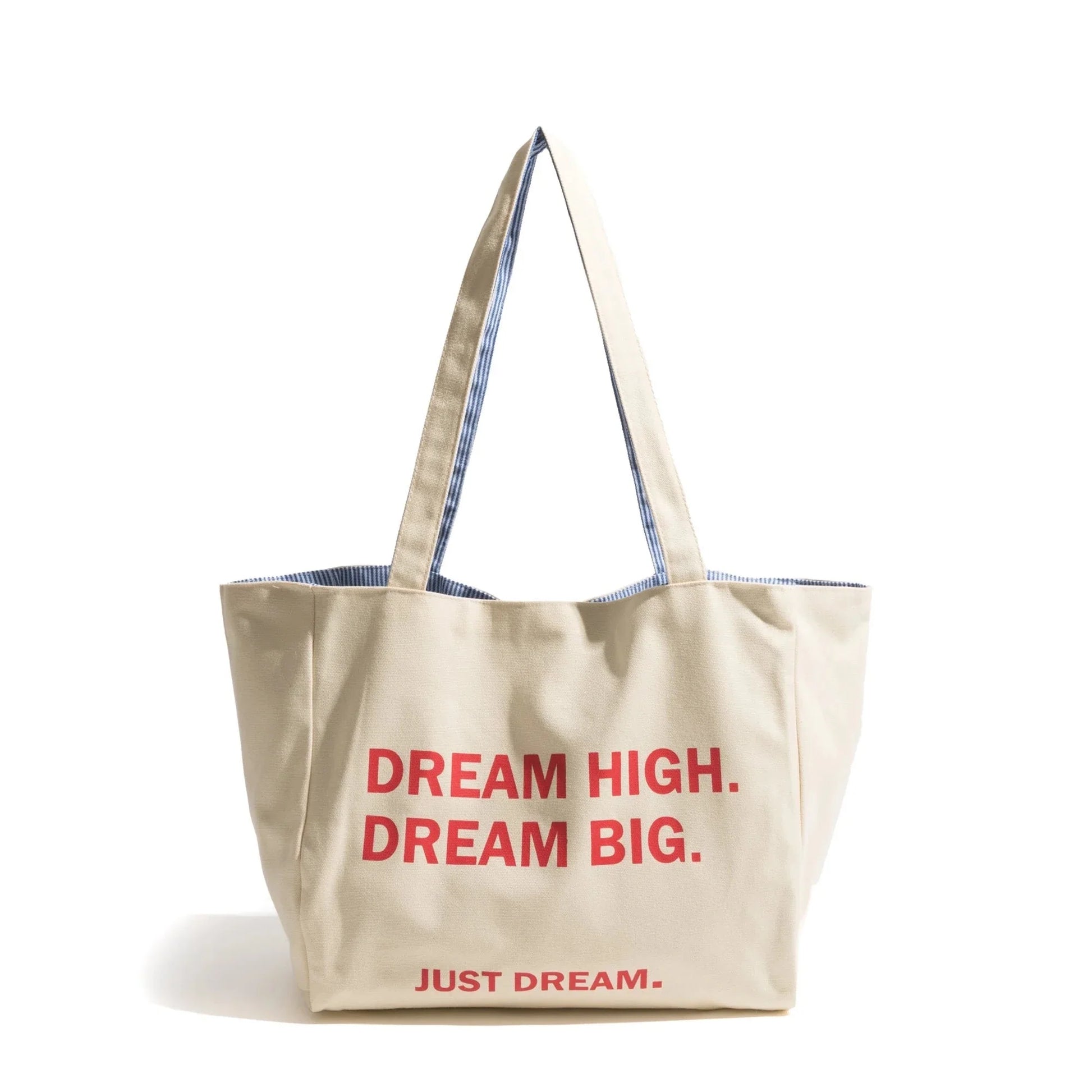 Dream high and big with this eco-friendly canvas tote! Featuring a letter-printed eco canvas design with color contrasting blue pinstripe lining. you'll look stylish and sustainable everywhere you go! Plus. the eco-friendly fabric means you'll feel as good as you look! All you need to do is just dream high and dream big!