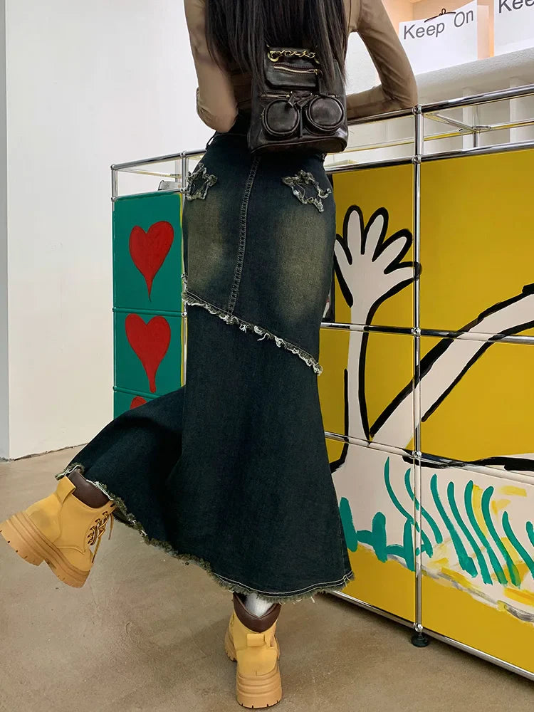 High Waist Raw Trim Mermaid Hem Long Denim Skirt