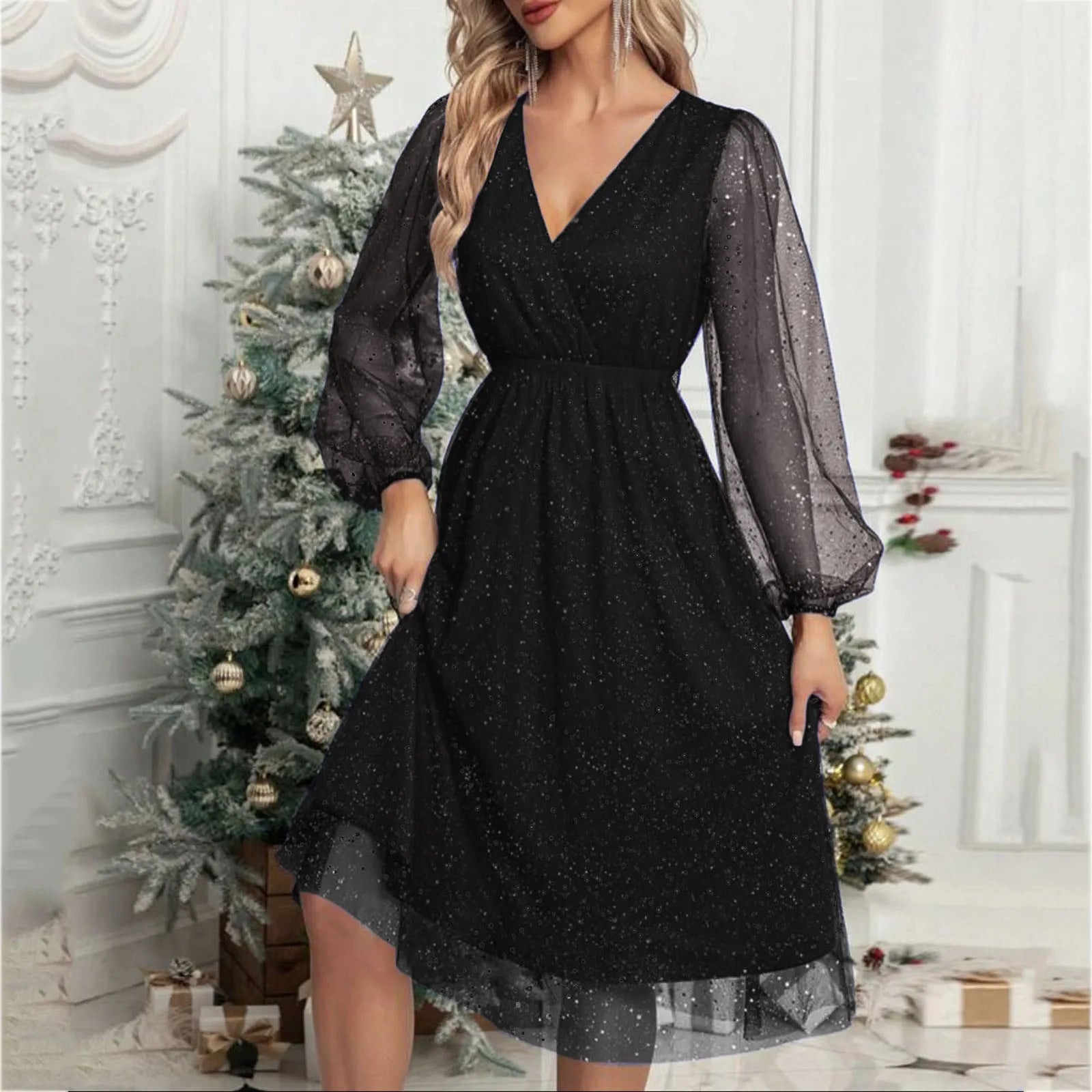 Elegant A-Line Mini Evening V Neck Mesh Long Sleeve Glitter Party Club High Waist Tulle Formal Dress