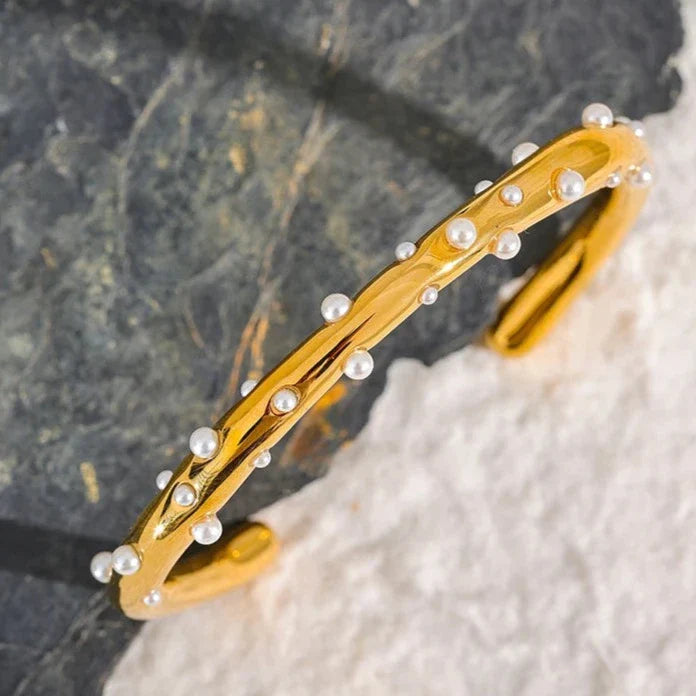 Introducing our Elegant Sprinkled Pearls Cuff Bracelet. perfect for adding a touch of sophistication to any outfit. Featuring delicate pearls sprinkled throughout the elegant cuff design. this bracelet exudes luxury and exclusivity. Elevate your style with this exquisite piece of jewelry.