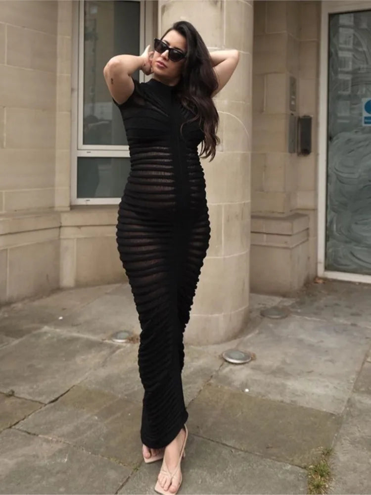 Elegant Striped Solid Sleeve Knit Elastic Maxi Dress