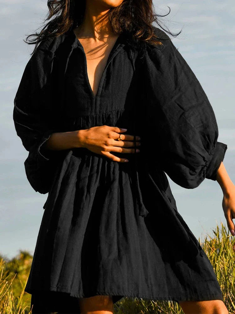Elegant V-Neck Lace-Up Summer Casual Pleated Boho Dress