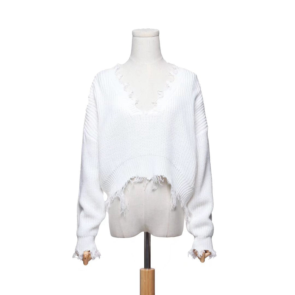 Destroyed and distressed sweaters never look this cool. Fringed edges and cropped with deep v-neck goes off the shoulder and great for layover tank tops and more. And you can totally wear it front/back reversed. too! Emily is back to rock the streets!Â