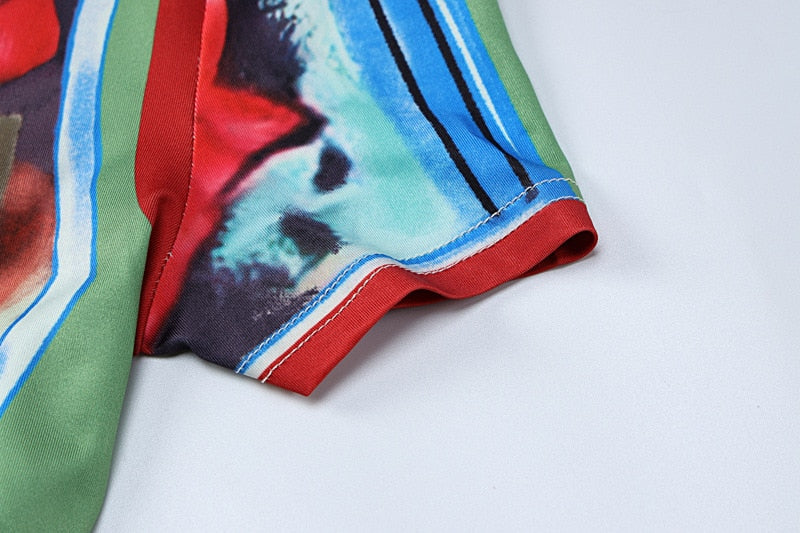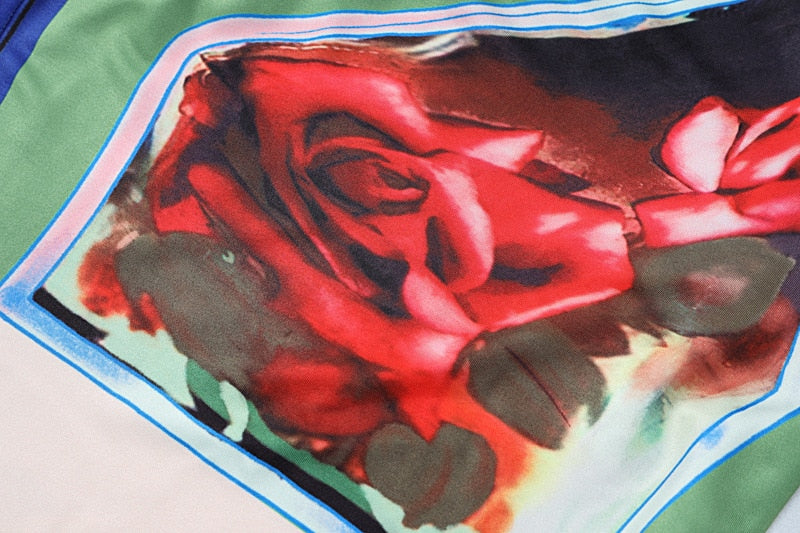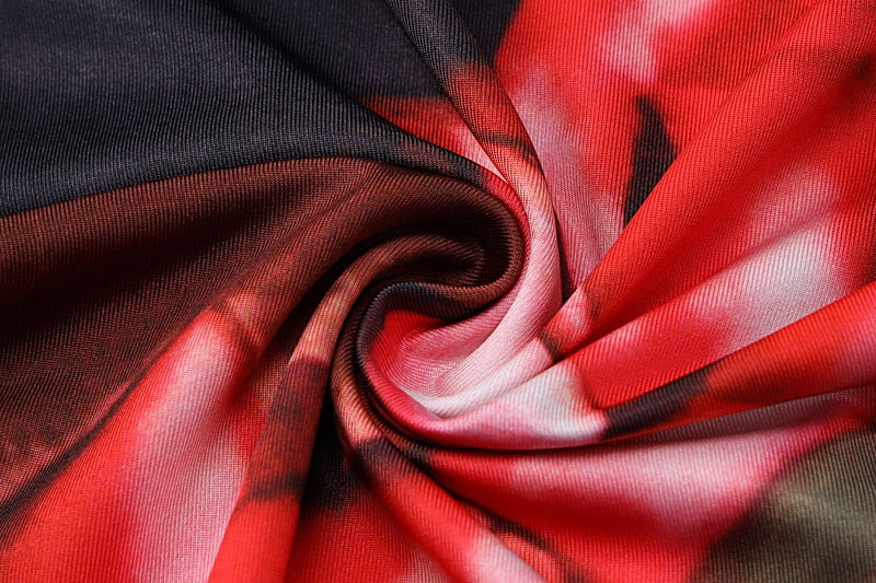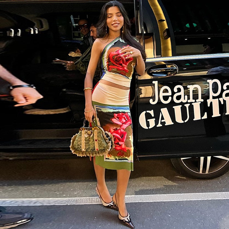Emmanuel Floral Prints One Shoulder Dress. Beautiful 2-piece red rose prints bodycon dress with sexy one shoulder top and side slit skirt. Casual yet figure flattering silhouette with colorful bold floral prints.Â