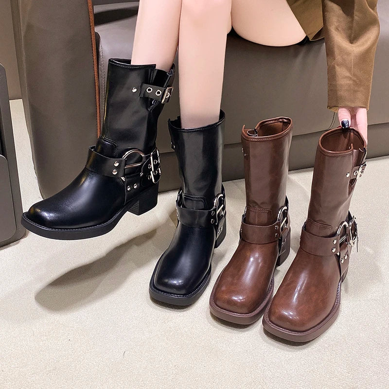 European American Western Cowboy Spring Metal Buckle Square Head Ankle Boot