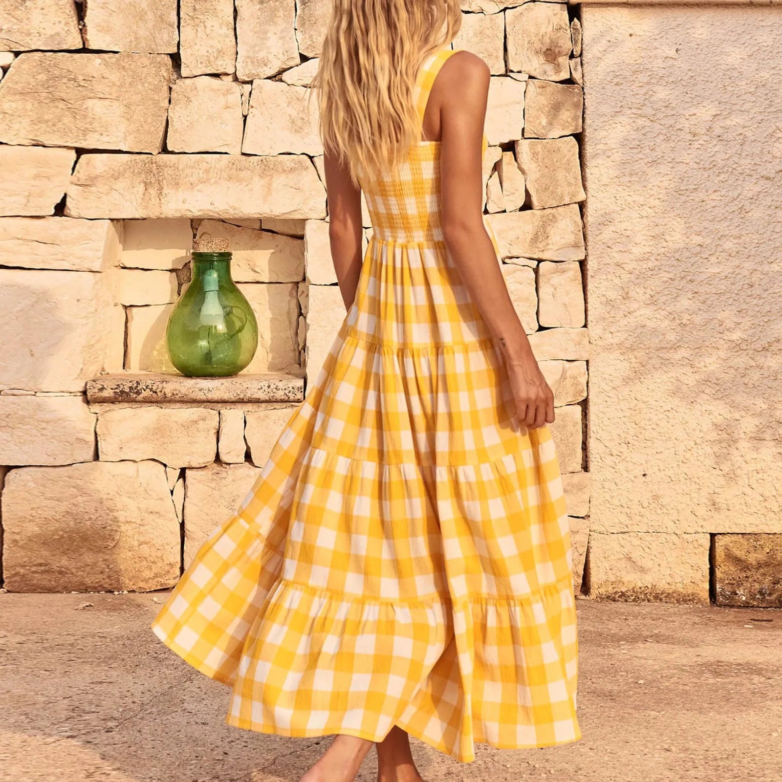 Fashionable Loose Strappy Plaid Vacation Beach Party Sleeveless Casual Tiered Midi Dress