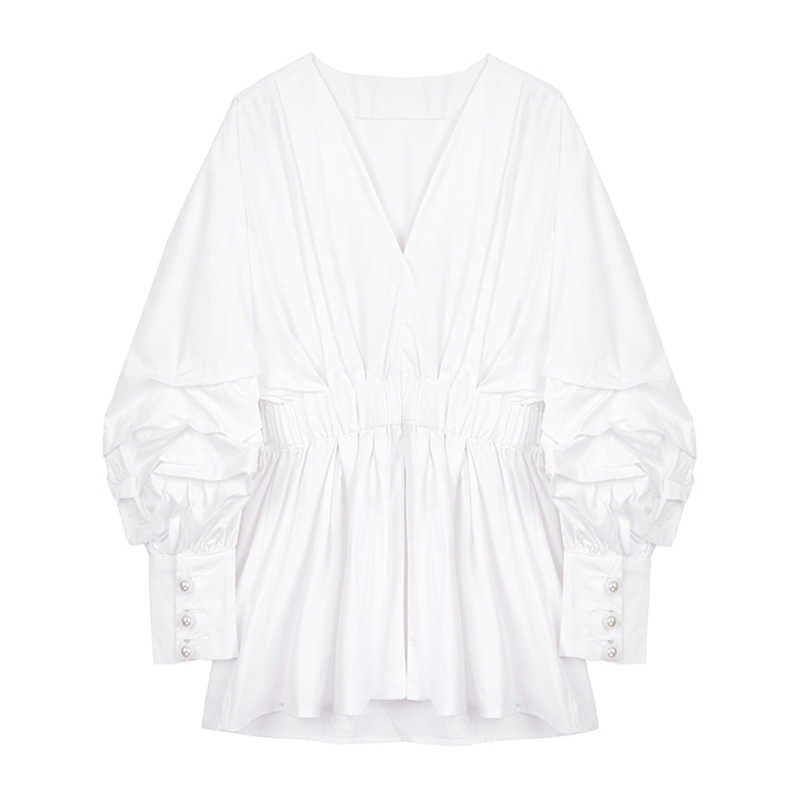 Fatima Denim Cummerbund Blouse. White puff sleeve shirts blouse with distressed denim Cummerbund. Trendy ruffle sleeves blouse with elastic waisted blouse. Wear with or without the belt.Â