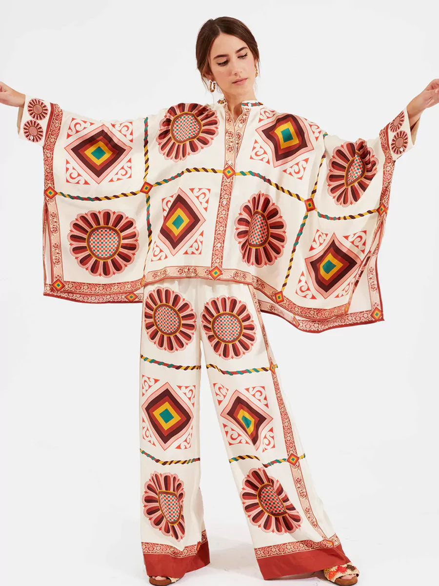 Fine Satin Floral Print Batwing Sleeve Pants Set - Off-white