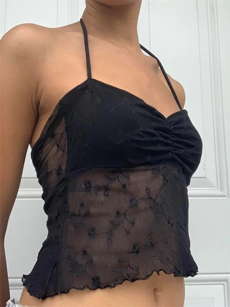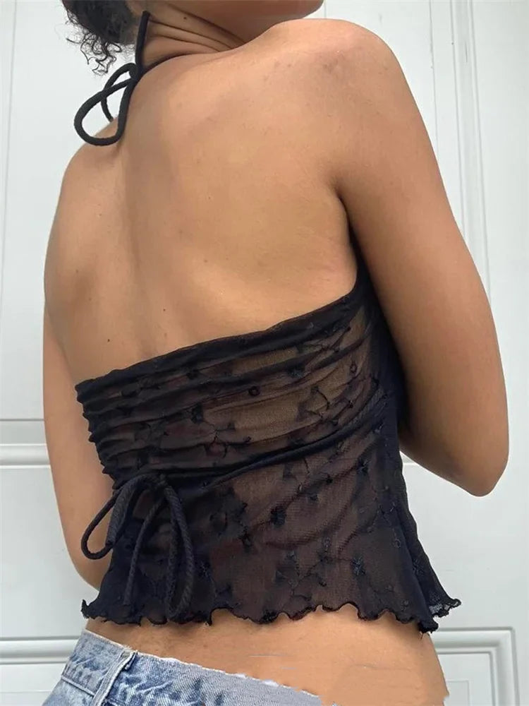 Flower Mesh Patchwork Fairycore Retro Halter Y2K Aesthetics Backless Summer Boho Beach Tank Crop Top