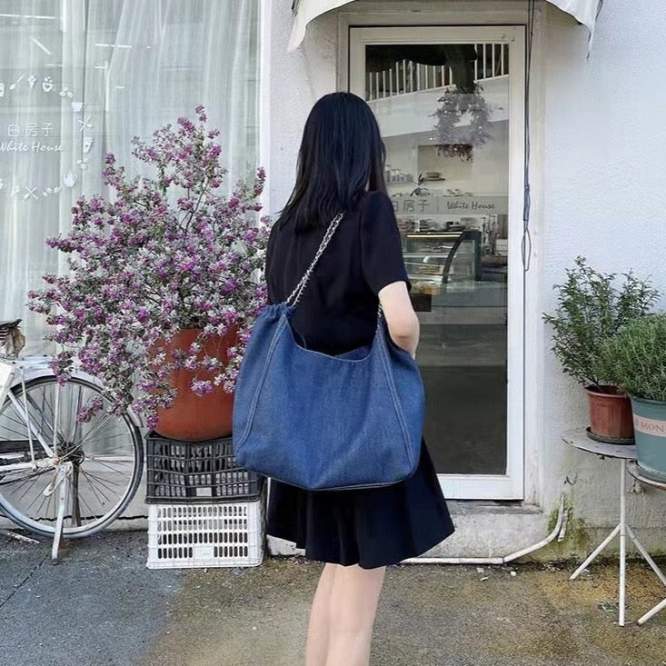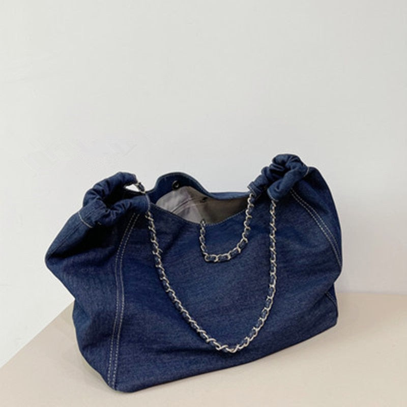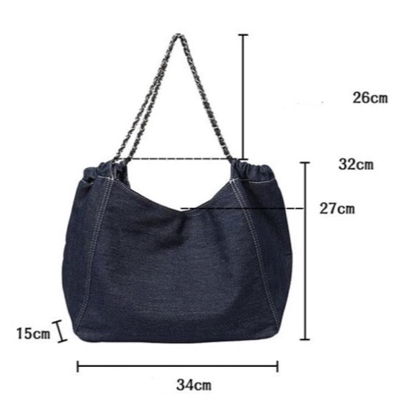 Francoise Large Denim Tote Braided Chain Straps - 2 Colors. Casual Large denum tote with pouplar braided chain shoulder straps. French chic style for effortless everyday wear and styles. Comes in two popular denim colors - Black or Dark French blue.