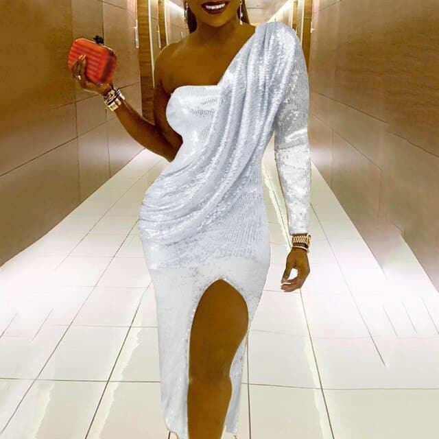 Free Shipping One Shoulder Dress Sparkle Glitzy Sequins Dress Fashion Cold Shoulder Celebrity Christmas Party