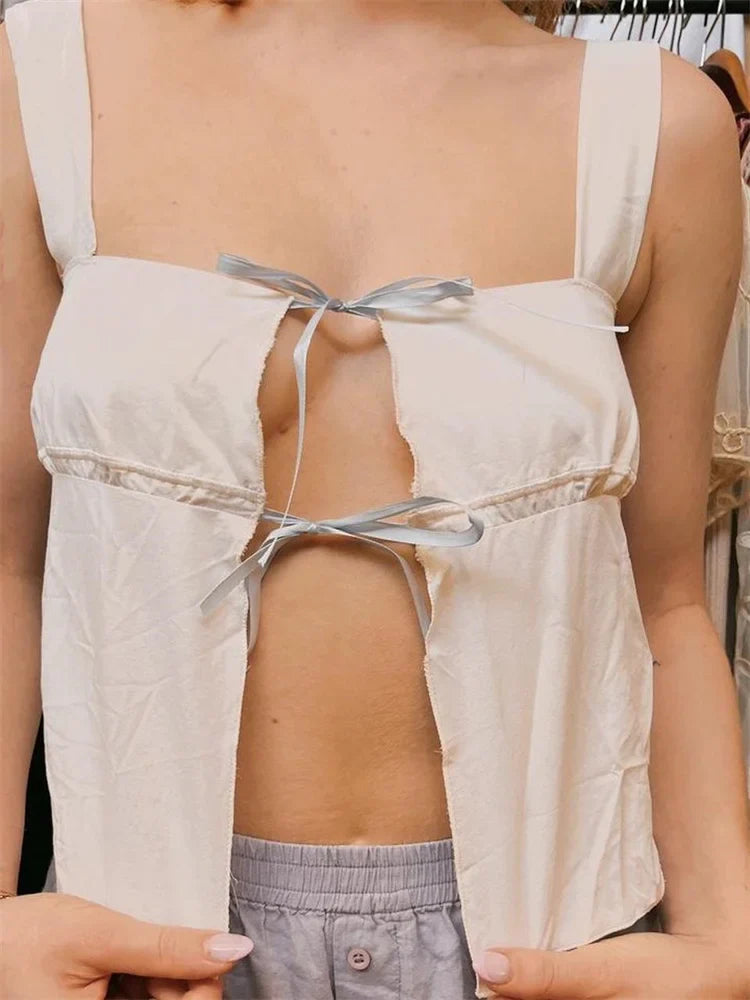 Front Split Lace-up Sleeveless Strap Square Neck Solid Color Causal Slim Fit Y2K Vest Crop Top